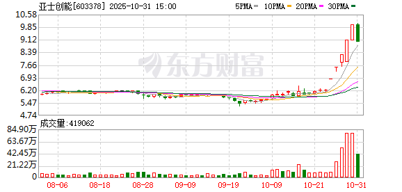 | 日期 | 当日涨跌幅(%) | 换手率(%) | 主力资金净流入(万元) | | --- | --- | --- | --- | | 2025.10.29 | 10.04 | 18.39 | -1537.79 | | 2025.10.28 | 9.97 | 12.22 | 1444.85 | | 2025.10.27 | 9.94 | 6.53 | 2282.48 | | 2025.10.24 | 9.97 | 2.52 | 3486.05 | | 2025.10.23 | 0.32 | 2.10 | -247.45 | | 2025.10.22 | 0.98 | 2.29 | 473.73 | | 2025.10.21 | 2.50 | 2.02 | 395.09 | | 2025.10.20 | 1.01 | 2.02 | -1.30 | | 2025.10.17 | -3.10 | 3.21 | -416.08 | | 2025.10.16 | 4.62 | 5.56 | 857.91 | 亚士创能盘中涨停,已连收5个涨停板,截至9:40,该股报10.01元,换手率6.27%,成交量2687.96万 ...
