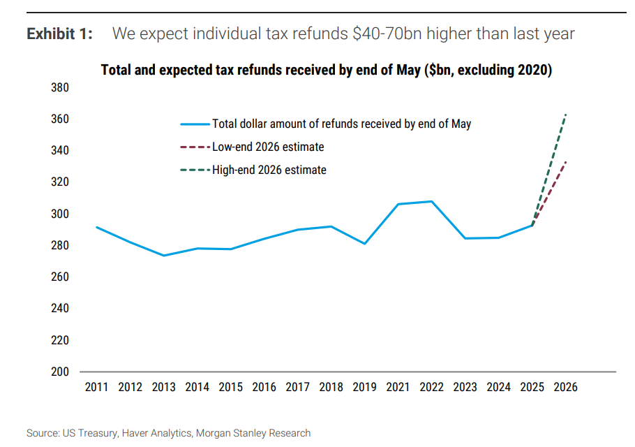 美国消费者即将迎来一场规模空前的"现金雨"。 据追风交易台,根据摩根士丹利1月23日发布的最新研报,得益于"大漂亮法案"(One Big Beautiful Bill Act, OBBBA)中的追溯性条款,2026年第一季 度的个人收入将出现飙升。预计到5月底,个人退税总额将达到约3500亿美元(约合2.5万亿人民币),同比激增20%。 这一轮退税潮并非自然增长,而是政策人为制造的"强心针"。OBBBA法案包含了大量针对2025财年的追溯性消费者减税措施。由于去年的预扣税表并 未及时调整,消费者将在接下来的几个月内通过退税一次性获得这些红利。 减税细节: 这些红利主要来自对加班费、小费、老年人扣除额、汽车贷款利息的减免,以及州和地方税收减免上限和儿童税收抵免的 提高。 关键数据: 摩根士丹利预计,今年的个人退税额将比去年高出400亿至700亿美元。如果收到退税的消费者数量保持不变,平均退税规 模将增加550美元,达到约3500美元的历史高位。 对于投资者而言,这意味着什么?大摩指出: 短期消费提振:尽管市场普遍预计2026年初实际消费增长将放缓,但这笔巨额退税将为全年支出提供支撑,尤其是在上半年。 流动性注入 ...