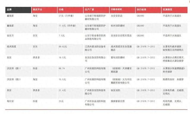 行业概况与监管背景 - 过滤式消防自救呼吸器(俗称消防面罩)是火场逃生不可或缺的救命设备 用于避免吸入火灾产生的一氧化碳及烟雾等有害气体[7] - 国家消防救援局联合国家市场监管总局于2024年12月至2025年2月在全国部署开展了该产品的质量安全专项整治行动[7] - 专项检查发现各地仍普遍存在使用伪劣、过期过滤式消防自救呼吸器的情况[7] 产品标准与假冒问题 - 合格的消防逃生面罩执行专门的强制性标准GB 21976.7-2012[2] - 实测发现电商平台上有三款产品实为自吸过滤式防毒半面罩 执行工业标准GB2890 无法防火防烟且不适用于火场逃生[2] - 这些假冒产品在宣传页标注为“消防四件套家用、出租房、灭火器” 部分平台月销量超7000件[2] 产品实测性能问题 - 实测从佩戴贴合程度、过滤物是否严密、阻燃性三个维度展开[1] - 部分标称符合国标的面罩存在滤嘴塞材质偏脆易拉断、与口鼻适配度一般存在缝隙等问题[3] - 阻燃性测试中 有面罩头套部分在接触火源后持续燃烧甚至产生明火[1] - 同一品牌(广州双盾消防科技有限公司)的两款消防面罩出现截然不同的测试结果 一款持续燃烧、一款阻燃性良好[1] 具体产品测试结果 - **战术国度**(京东 69.82元):头罩有灼烧痕迹并烧穿 较快熄灭无持续明火[5][6] - **友安**(拼多多 18.5元):头罩部分点燃后熄灭 持续用火源靠近面罩会被烧穿[5][6] - **泉安**(拼多多 21.4元):面罩透明部分和头罩均有灼痕 无破损、无明火[5][6] - **每日安**(抖音 25元):面罩与头罩均有灼痕 无明火、无破损[5][6] - **天安邦(款1)**(淘宝 60.74元):头罩部分快速燃烧超1秒并烧穿[6] - **沃安邦(款2)**(淘宝 40.5元):阻燃性良好 未烧穿[6]