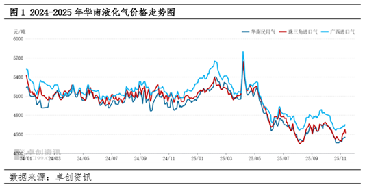 11月上旬市场表现 - 华南液化气市场价格震荡上涨,涨幅普遍在100-150元/吨 [3] - 供应减量是价格上涨的主要支撑,广西石化乙烯装置投产导致液化气自用量增加,北海民用气外放量小幅下降 [3] - 进口码头到船量偏少,上旬整体到船量约13万吨,部分码头到船时间推迟加剧市场供应紧张 [3] 11月中下旬市场展望 - 市场供应预期增加,中海油惠炼暂停管输壳牌,茂名石化乙烯装置计划月底停工,广石化12月初检修结束,民用气商品量日增量将由六七百吨逐步至二千吨以上 [3] - 进口供应集中,11月中下旬预计进口到船量约50万吨,市场供应面由偏紧转向宽松 [3] - 进口到岸成本预期下行,12月CP丙烷预期在468美元/吨,丁烷预期在462美元/吨,12月进口到岸成本较11月呈下降趋势 [5] 终端需求与国际市场 - 终端需求呈现连年萎缩态势,尽管处于需求旺季但整体表现不及预期,抑制下游企业补货积极性 [5] - 国际市场表现弱势,12月国际现货商谈贴水较11月略低 [5] - 在供应增加、成本下行及需求疲软多重因素下,预计11月中下旬价格呈震荡下行趋势,或再度触及淡季低点 [5]
