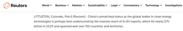 行业地位与核心观点 - 中国正在引领全球清洁技术行业的发展,其中最具代表性的是中国电动汽车的对外出口 [1] - 中国电动汽车出口的快速增长有助于提升中国在清洁能源技术领域的领先地位 [1][5] - 随着购买中国电动汽车的人越来越多,消费者也日益青睐中国生产的其他清洁技术产品,例如住宅太阳能电池板、电池存储系统和空调 [7] 市场表现与出口数据 - 2025年,中国电动汽车远销150多个国家和地区 [1] - 在中国制造业中,电动汽车占据重要地位,一半以上的新车都是电动汽车 [1] - 中国电动汽车的最大市场是比利时,英国和阿联酋紧随其后 [2] - 富裕国家正在进口越来越多的中国电动汽车 [2] - 过去一年中,中国电动汽车订单年度增长最显著的是非洲,其次是中东地区,在亚洲和大洋洲的销量也增幅明显 [2] 业务扩展与产业链影响 - 中国的电动汽车出口商能够大幅度扩大其销售量,同时增加服务及售后业务,这些服务还包括电池系统、电网管理部件、供暖和制冷设备等 [5] - 随着电动汽车销量增加,充电基础设施的需求也在不断增长,政策制定者和电力公司需要紧急确保本地电网能够投入使用 [5] - 这帮助中国领先的电网管理和清洁能源技术产品在这些能源系统的建设中占有一席之地 [5]