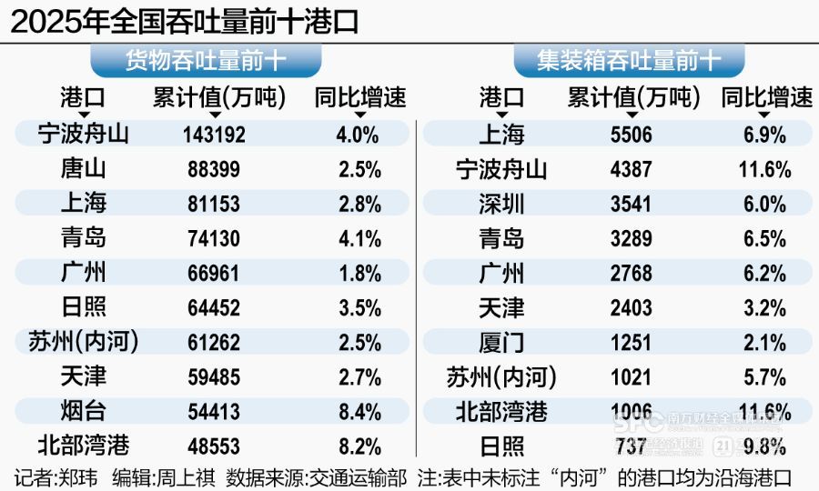 2025年中国港口运营表现 - 2025年全国货物与集装箱吞吐量前十港口排名保持稳定[1] - 全国集装箱吞吐量超千万标箱的港口数量扩容至9个,新增苏州港(内河)1021万标箱和北部湾港1006万标箱[1][8] - 2025年全国共有26个港口集装箱吞吐量实现两位数以上正增长,其中沿海港口8个、内河港口18个[1] - 无锡港(内河)、云南港(内河)和洋浦港的集装箱吞吐量增速分别达到108.2%、95.7%和65.4%,领跑全国[1] 头部港口吞吐量数据 - 宁波舟山港2025年货物吞吐量达143192万吨,同比增长4.0%,连续17年位居全球第一,成为全球首个年货物吞吐量超14亿吨的港口[4][5] - 上海港2025年集装箱吞吐量达5506万标箱,同比增长6.9%,自2010年起连续十六年位居全球首位[4][7] - 宁波舟山港2025年集装箱吞吐量达4387万标箱,同比增长11.6%,位居全国第二[4][7] - 货物吞吐量排名第二、三位的分别是唐山港88399万吨(同比增长2.5%)和上海港81153万吨(同比增长2.8%)[4][6] - 青岛港货物吞吐量74130万吨(同比增长4.1%),集装箱吞吐量3289万标箱(同比增长6.5%)[4][6] - 北部湾港货物吞吐量48553万吨(同比增长8.2%),集装箱吞吐量1006万标箱(同比增长11.6%)[4][9] 重点港口发展动态与支撑因素 - 宁波舟山港的领先地位由快速增长的贸易和密集的航线网络支撑:2025年浙江省进出口总值5.55万亿元,同比增长5.4%;港口拥有309条集装箱航线,连接全球700多个港口,2025年海铁联运业务量超200万标准箱[5] - 苏州港(内河)的崛起背靠汽车等关键产业与长江航线网络:其太仓港是江苏汽车出口第一大港,2025年全年出口汽车突破80万辆,占全国份额超十分之一;截至2025年初,该港是长江沿线航线数量最多、覆盖最广的港口[8] - 北部湾港实现跃升,集装箱吞吐量从2017年的228万标箱增长至2025年的1006万标箱,年均增长超20%;其发展受益于西部陆海新通道,海铁联运班列覆盖中西部18省(区、市);预计2026年竣工的平陆运河将为其带来更广阔货源腹地[9] 2026年港口发展方向:基建与航线加密 - 加快航道网络建设、加密国际航线是2026年的发展方向之一[2][10] - 2026年开年首月,青岛港已开通4条集装箱新航线,外贸航线总数扩容至近240条,实现与全球180多个国家和地区的700多个港口互联互通[10] - 烟台港相继开通多条国际航线,目前国际航线已增至150余条,其中非洲航线覆盖20余个国家和地区[10] - 2026年浙江省政府工作报告提出,要加快高等级航道网络建设,实现大宗货物“亿吨转水”,多式联运集装箱运量增长50%以上,并推动中欧北极集装箱航线夏季固定区间常态化运行[10] 2026年港口发展方向:新消费业态 - 以港口为依托的邮轮、游艇等新消费业态正迎来政策风口,广东、辽宁、上海等多座沿海省份在2026年政府工作报告中均提出布局相关新消费热点[2][11] - 广东省明确将“加快推动粤港澳游艇自由行”及“促进邮轮游艇旅游消费”纳入重点工作,并计划推出邮轮游艇、潜水观光等旅游产品,打造“跳岛游”等旅游线路[11] - 上海提出2026年要进一步扩大服务消费,丰富邮轮消费供给,提升滨江邮轮带联动带动效应[11] - 辽宁提出要大力培育邮轮游艇等新兴休闲消费[11] - 游艇消费成为全国促消费政策焦点:截至2025年底,中国登记有效游艇共计9850艘,近三年新登记游艇约占游艇总数54.7%[12] - 交通运输部正在加快研究制定扩大游艇消费的若干措施,以促进游艇产业向大众化消费、规模化发展转型[12] 港口角色演变 - 行业观点认为,港口正从传统的出口枢纽向整合资源、服务产业、创造价值的消费节点转变,其竞争力未来将体现在服务的深度与广度上[3][13] - 专家指出,在粤港澳大湾区、长三角等海岸线绵长的地区,蕴藏着如游艇经济等尚未充分开发的新兴经济活动,发掘这些新增量是驱动消费增长的关键[13]