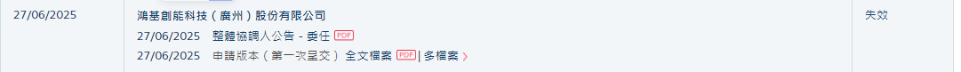 根据招股书显示,该公司自述是全球领先的独立膜电极供货商,专门从事催化剂涂层质子膜(CCM)及膜电极(MEA)的研发、量产及商业化。根据灼识咨询 的资料,以膜电极销量计,鸿基创能于2024年是中国最大的独立膜电极供货商及全球第二大独立膜电极供货商。 鸿基创能科技于6月27日所递交的港股招股书满6个月,于12月27日失效,海通国际、中信证券为联席保荐人。 | 27/06/2025 | 鴻基創能科技(廣州)股份有限公司 | 失效 | | --- | --- | --- | | | 27/06/2025 整體協調人公告 - 委任 四 | | | | 27/06/2025 申請版本(第一次呈交)全文檔案 四川多個案》 | | | | 好好切服中目二 沈八三台社員公瑞版七分瑞士被中扣4代体 十门儿童账儿刘论写后了曲(COV)及雄中机(AC)(KBIT(A) 昌文卫农业)() 好报)长1)站 | | ...