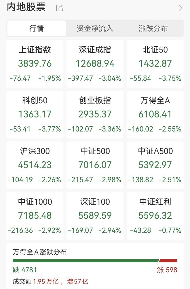 记者丨陈思颖 见习记者张嘉钰 编辑丨张楠 10月17日,A股市场全天震荡调整,三大指数盘中均跌超2%。截至收盘,沪指跌1.95%,深成指跌 3.04%,创业板指跌3.36%。沪深两市成交额1.94万亿,较上一个交易日放量69亿。全市场近4800只个股 下跌。 | 内地股票 | | --- | | 行情 | 资金净流入 | 涨跌分布 | | --- | --- | --- | | 上证指数 | 深证成指 | 北证50 | | 3839.76 | 12688.94 | 1432.87 | | -76.47 -1.95% -397.47 -3.04% -55.84 -3.75% | | | | 科创50 | 创业板指 | 万得全A | | 1363.17 | 2935.37 | 6108.41 | | -53.41 -3.77% -102.07 -3.36% -160.02 -2.55% | | | | 沪深300 | 中证500 | 中证A500 | | 4514.23 | 7016.07 | 5392.97 | | -104.19 -2.26% -215.47 -2.98% -138.82 -2.51% | | ...