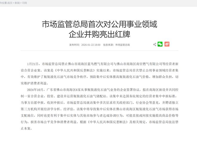 预防推高瓶装液化石油气价格 公用事业领域并购首次被禁 市场监管总局:集中后实体将在当地获得垄断地位