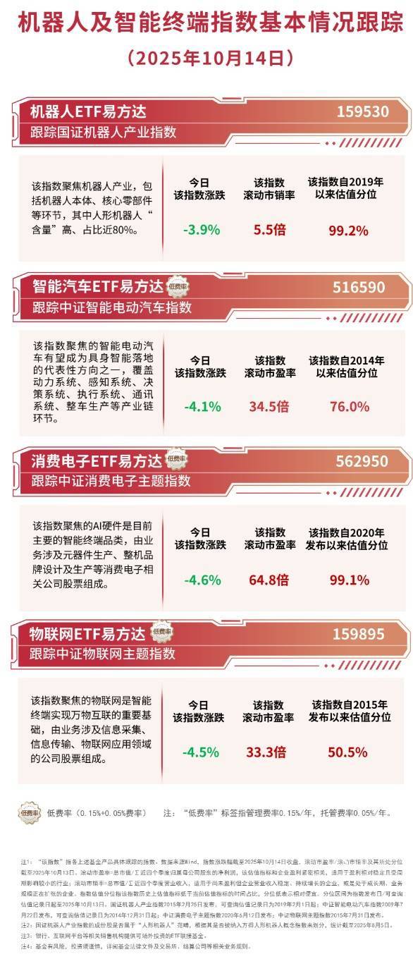机器人板块今日延续调整,截至收盘,国证机器人产业指数下跌3.9%,中证智能电动汽车指数下跌 4.1%,中证物联网主题指数下跌4.5%,中证消费电子主题指数下跌4.6%。据Wind数据统计,截至昨 日,机器人ETF易方达(159530)节后连续3日吸金,合计超2亿元。 中信建投证券表示,当前Optimus三代样机发布及量产节奏指引积极,国产链条订单出货、资本化运作 表现积极;市场整体流动性宽松下,看好机器人重回科技成长配置主线。 每日经济新闻 | 跟踪中证物联网主题指数 | | | ·· | | --- | --- | --- | --- | | 该指数聚焦的物联网是智能 终端实现万物互联的重要基 | �日 | 该指数 | 该指数自2015年 | | | 该指数涨跌 | 发动市盈率 | 发布以来估值分位 | | 础,由业务涉及信息采集、 | | | | | 信息传输、物联网应用领域 | -4.5% | 33.3倍 | 50.5% | | 的公司股票组成。 | | | | ...