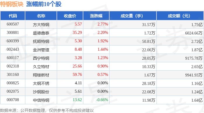 证券之星消息,10月22日特钢板块较上一交易日上涨0.23%,方大特钢领涨。当日上证指数报收于 3913.76,下跌0.07%。深证成指报收于12996.61,下跌0.62%。特钢板块个股涨跌见下表: | 代码 | 名称 | 收盘价 | 涨跌幅 | 成交量(手) | 成交额(元) | | --- | --- | --- | --- | --- | --- | | 600507 | 方大特钢 | 5.57 | 2.77% | 31.57万 | 1.75亿 | | 300881 | 盛德整泰 | 35.29 | 2.20% | 1.72万 | 6024.66万 | | 665009 | 抚顺特钢 | 5.30 | 1.92% | 50.81万 | 2.72亿 | | 002443 | 金洲管道 | 8.48 | 1.44% | 0 22.00万 | 1.87亿 | | 600117 | 西宁特钢 | 3.28 | 1.23% | 28.05万 | 9175.78万 | | 002318 | 久立特材 | 25.66 | 0.90% | 10.33万 | 2.65亿 | | 301160 | 翔楼新材 | 59.7 ...
