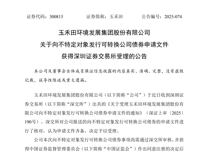 乐居财经 李兰 10月19日,玉禾田(300815.SZ)发布关于向不特定对象发行可转换公司债券申请文件获深交所受理公告,保荐人为国泰海通证券 股份有限公司。 玉禾田本次发行募集资金总额不超过15亿元,扣除发行费用后,拟投入环卫设备配置中心项目、补充流动资金。 | | | | 序号 | 项目名称 | 投资总额 | 拟用募集资金投入总额 | | --- | --- | --- | --- | | | 环卫设备配置中心项目 | 167,249.80 | 114,656.30 | | 2 | 补充流动资金 | 35,343.70 | 35,343.70 | | | 合计 | 202,593.50 | 150,000.00 | 玉禾田成立于2010年4月,注册资本3.99亿元,主营业务为城市运营和物业管理,同属环境卫生管理业务。 截至募集说明书签署日,西藏天之润直接持有玉禾田1.91亿股股份,占总股本的比例为47.92%;同时,西藏天之润通过控制深圳鑫宏泰间接控 制3.54%的股份,合计控制51.45%股份,为公司控股股东。 周平持有西藏天之润90%的股权,周梦晨持有西藏天之润10%的股权,周平、周梦晨通过控制西藏天 ...