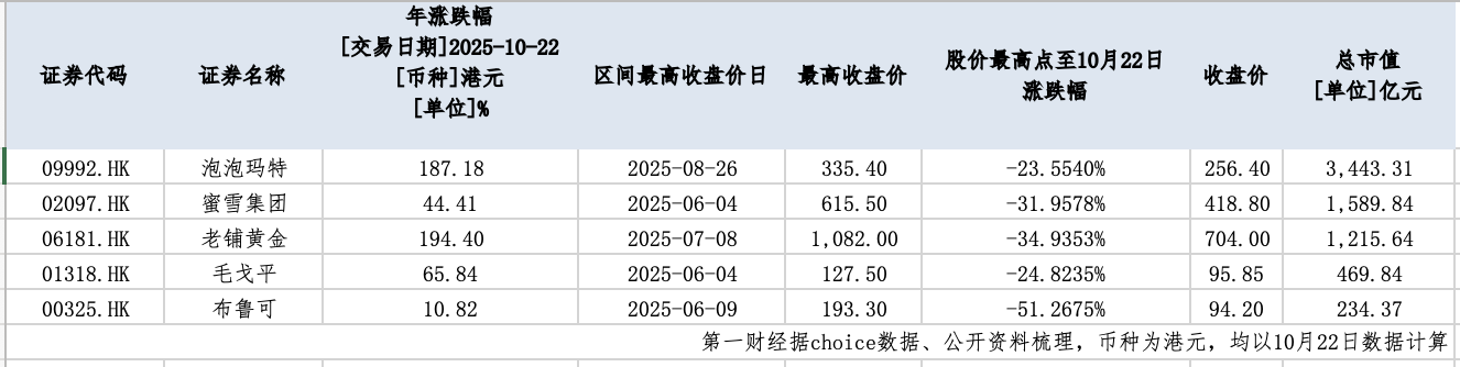 港股新消费板块近期表现 - 港股新消费板块近期遭遇集体重挫,多只明星股自年内高点大幅回落,从一路高歌猛进走向“杀估值”的急剧下跌 [1] - 10月23日,泡泡玛特盘中一度跌近11%,最终报收232.4港元/股,跌幅9.36%,最新总市值为3121亿港元 [1] - 泡泡玛特、老铺黄金、蜜雪集团等明星股较年内高点已普遍跌幅超20%,三大龙头市值蒸发超2800亿港元 [1][3] 主要个股股价与市值变动 - 泡泡玛特以8月26日的历史高点339.8港元计算,在不到两个月内累计跌幅已超过32%,市值自高点4504亿港元缩水至3121亿港元 [3][4] - 老铺黄金自7月8日创下的1082港元历史高点以来,累计跌幅超34.93%,市值从1868亿港元骤减至1195亿港元 [3][4] - 蜜雪集团自6月4日615港元的高点回调幅度超过31%,市值从2336亿港元跌落至1518亿港元,退出“2000亿俱乐部” [3][4] - 毛戈平、布鲁可较年内高点分别下跌超24%和51% [3] 资金流向与机构分歧 - 资金流向显示,南下资金仍是做多主力,向5家概念股净流入33.37亿港元 [6][7] - 香港本地中介机构、中资中介和国际中介机构资金出现撤离,分别净流出2.16亿港元、14.66亿港元和13.66亿港元 [6][7] - 近期资金格局与上半年相比发生明显变化,4月8日~6月9日期间,南下资金和香港本地中介曾分别加仓63.7亿港元和4.9亿港元 [6] 市场调整的核心驱动因素 - 市场对行业增长可持续性产生担忧,例如投资者担忧泡泡玛特收入增速或于今年见顶,明年起增长动能可能放缓 [8] - 市场正重新审视新消费企业的商业本质与定位匹配度,例如老铺黄金产品外包生产比例攀升而研发投入占比下降,蜜雪集团主要食材产能利用率持续下滑 [9] - 个股前期涨幅巨大,泡泡玛特、老铺黄金、蜜雪集团年内最大涨幅分别达310%、309%和112,积累了显著的获利了结压力 [10] 行业基本面与未来展望 - 部分个股即使在业绩向好的背景下仍难挡跌势,泡泡玛特第三季度整体收益同比增长245%-250%,但公告后股价连续下挫 [5] - 行业分析指出,港股新消费板块存货周转率下滑至历史较低水平,整体处于“被动加库存”周期,供需格局有恶化端倪 [10] - 也有机构看好消费板块中长期走势,认为在宏观逻辑支撑下新消费演绎的空间仍十分广阔,消费观念变革叙事或有望持续演绎 [11]