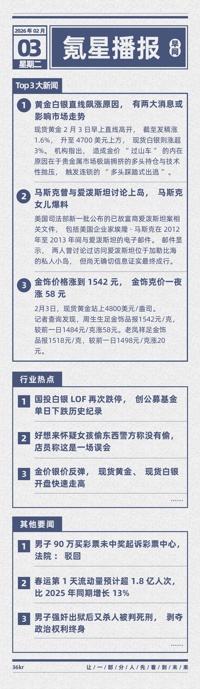 贵金属市场动态 - 现货黄金价格在2月3日早上直线高开,截至发稿时上涨1.6%,升至4700美元上方,随后现货黄金价格站上4800美元/盎司 [5] - 现货白银价格在2月3日早上涨超3% [5] - 周生生足金饰品报价为1542元/克,较前一日1484元/克上涨58元,老凤祥足金饰品报价为1518元/克,较前一日1498元/克上涨20元 [5] - 金价银价在开盘后快速走高,出现反弹 [4][6] - 机构分析指出,金价“过山车”行情的内在原因在于贵金属市场极端拥挤的多头持仓与技术性抛压,触发了连锁的“多头踩踏式出逃” [5] 特定公司及产品表现 - 国投白银LOF基金再次跌停,创下公募基金单日下跌历史纪录 [4][5] - 寒武纪公司股价一度大跌13.38%,半天内市值蒸发近700亿元 [4] - 周生生公司就足金挂坠质量问题积极开展调查工作 [4] 科技与互联网行业监管 - 有72款APP因违法违规收集使用个人信息问题被通报 [4] 宏观经济与社会数据 - 春运第一天流动量预计超过1.8亿人次,比2025年同期增长13% [4][6]