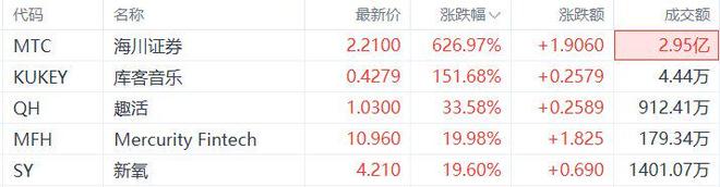 美股异动丨海川证券暴涨626.97%,为涨幅最大的中概股