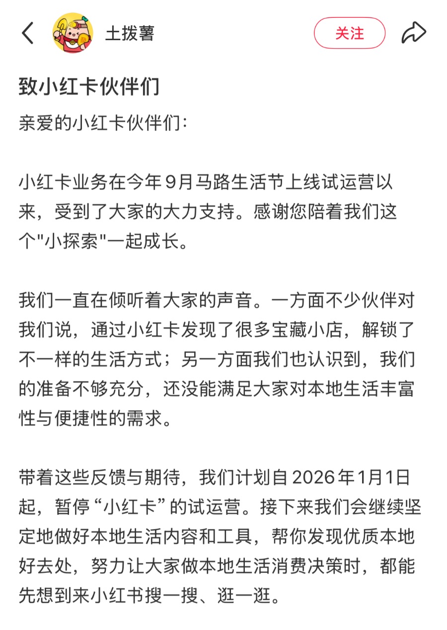 12月8日,小红书官方发布公告,宣布其本地生活会员产品"小红卡"将于2026年1月1日起暂停试运营,并为所有购卡用户办理全 额退款。这一决定距离"小红卡"在9月第三届马路生活节期间上线尚不足百日。 官方表示,"小红卡"团队接下来将阶段性集中资源,聚焦在本地生活内容影响力,提升本地生活交易产品和工具。 士拨薯 内容社区的"信任溢价"为何失效? 本地生活竞争的喧嚣从未停止,但真正的破局者鲜少出现。 不过,此次尝试的暂停并不意味着退场,更像是一次战术收缩与重新校准。小红书并不会放弃本地生活这一赛道,就像其过往 在商业化上的探索一样,小红书也将继续寻找更适合它的商业闭环路径。 "小而美"的本地生活 在喧嚣的本地生活竞争中,此前的小红书试图走出一条基于自身社区基因的差异化道路。 关注 致小红卡伙伴们 亲爱的小红卡伙伴们: 小红卡业务在今年9月马路生活节上线试运营以 来,受到了大家的大力支持。感谢您陪着我们这 个"小探索"一起成长。 我们一直在倾听着大家的声音。一方面不少伙伴对 我们说,通过小红卡发现了很多宝藏小店,解锁了 不一样的生活方式;另一方面我们也认识到,我们 的准备不够充分,还没能满足大家对本地生活丰富 性与便 ...