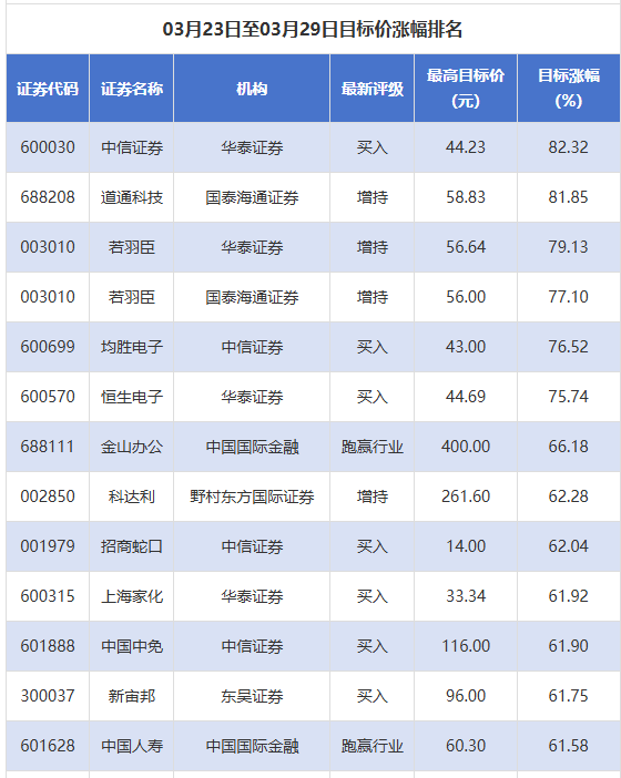 券商评级与目标价概览 - 3月23日至3月29日期间,券商共给出279次上市公司目标价,目标价涨幅排名前三的公司为:中信证券(目标价44.23元,涨幅82.32%)、道通科技(目标价58.83元,涨幅81.85%)、若羽臣(目标价56.64元,涨幅79.13%)[1] - 目标价涨幅排名前列的公司还包括:均胜电子(目标价43.00元,涨幅76.52%)、恒生电子(目标价44.69元,涨幅75.74%)、金山办公(目标价400.00元,涨幅66.18%)、科达利(目标价261.60元,涨幅62.28%)、招商蛇口(目标价14.00元,涨幅62.04%)[2] - 目标价涨幅较高的公司还涉及上海家化(涨幅61.92%)、中国中免(涨幅61.90%)、新宙邦(涨幅61.75%)、中国人寿(涨幅61.58%)、恒瑞医药(涨幅61.58%)、聚辰股份(涨幅59.93%)、北方华创(涨幅59.31%)、中国平安(涨幅57.68%)[2][3] 券商推荐热度排名 - 同期,共有352家上市公司获得券商推荐,其中卫星化学和中国人寿均获得17家券商推荐,新乳业获得16家券商推荐[3] - 推荐家数排名靠前的公司还包括:拓普集团(16家)、重庆银行(15家)、云天化(13家)、中国平安(13家)、渝农商行(12家)、海螺水泥(12家)、中国化学(11家)[4] 评级调整情况 - 评级调高方面,共有6家次上市公司被调高评级,包括:国金证券将华峰化学评级从“增持”调高至“买入”、华创证券将海天味业评级从“推荐”调高至“强推”、国海证券将中集车辆评级从“增持”调高至“买入”[4] - 其他被调高评级的公司有:中原证券将拓普集团评级从“增持”调高至“买入”、光大证券将特一药业评级从“增持”调高至“买入”、光大证券将天坛生物评级从“增持”调高至“买入”[5] - 评级调低方面,仅有1家次上市公司被调低评级,为华泰证券将豫园股份评级从“买入”调低至“增持”[5][6] 首次覆盖情况 - 同期,券商共给出81次首次覆盖,其中宁波银行获得华源证券给予“买入”评级,盛科通信获得天风证券给予“增持”评级,新易盛获得方正证券给予“强烈推荐”评级[6] - 其他被首次覆盖的公司包括:新疆天业(大同证券给予“谨慎推荐”评级)、华能国际(开源证券给予“买入”评级)、中国化学(国联民生证券给予“推荐”评级)、富祥药业(华鑫证券给予“买入”评级)、万邦德(东吴证券给予“买入”评级)[7] - 首次覆盖名单还包括:东阳光、康众医疗、日联科技、菲利华、海博思创、大秦铁路、深圳燃气、东北证券、长亮科技、星源材质、奥意康、力诺药包等公司[7]