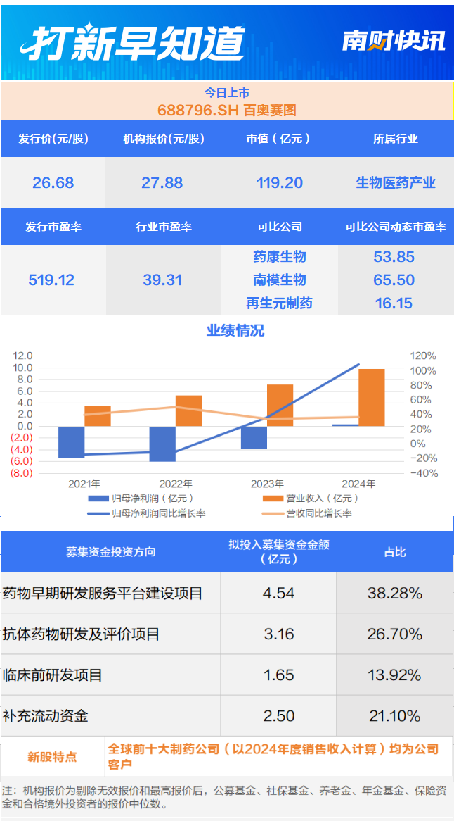 公司概况与上市信息 - 百奥赛图于12月10日在科创板上市,股票代码688796.SH,发行价为26.68元/股,发行市值119.20亿元,属于生物医药产业 [1][2] - 公司发行市盈率高达519.12倍,远高于39.31倍的行业市盈率,可比公司药康生物动态市盈率为53.85倍 [1] - 公司此前已于2022年登陆港交所,被称为“基因编辑第一股”,并于2023年6月递交科创板上市申请 [2] 业务与技术平台 - 公司是一家一体化企业,拥有基因编辑模式动物制备、创新模式动物繁殖与供应、临床前药理药效评价以及抗体药物发现四大技术平台 [2] - 技术基石为高效稳定的基因编辑平台,截至2025年6月30日,累计为客户完成定制化基因编辑项目约5300项,并自主开发出RenMice小鼠平台及各类模型超过4300种 [3] - 业务主要分为临床前药理药效评价、模式动物销售、抗体开发业务、基因编辑业务四类 [4] 财务与业绩表现 - 2024年上半年,模式动物销售业务营收为2.74亿元,占总营收的44.2% [4] - 2024年上半年,公司从第一大客户Gilead Sciences, Inc.获得营收0.88亿元,占当期营业收入总额的14.25% [4] - 公司拟投入募集资金11.85亿元,其中38.28%用于药物早期研发服务平台建设项目,26.70%用于抗体药物研发及评价项目,13.92%用于临床前研发项目,21.10%用于补充流动资金 [3] 客户与市场 - 主要客户群体为医药研发、生物科技企业及科研机构 [4] - 全球前十大制药公司均为公司客户 [3] - 公司采取直销模式,由公司或海外子公司直接与客户签订合作协议 [4] 行业与监管环境 - 公司服务于创新药研发企业,该行业受监管程度较高,各国药品临床试验及部分临床前试验均受当地法规监管及政策指导 [5] - 行业监管政策变动可能对公司经营产生影响,例如实验动物使用要求、境外创新药相关政策等 [5]