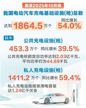 《人民日报海外版》(2025年11月20日 第 02 版) 责编:李芳、李雪钦 新华社北京11月19日电 记者19日从国家能源局获悉,截至2025年10月底,中国电动汽车充电基础设施 (枪)总数达到1864.5万个,同比增长54.0%。 其中,公共充电设施(枪)453.3万个,同比增长39.5%,公共充电桩额定总功率达到2.03亿千瓦,平均 功率约为44.69千瓦;私人充电设施(枪)1411.2万个,同比增长59.4%,私人充电设施报装用电容量达 到1.24亿千伏安。(记者 王悦阳) ...