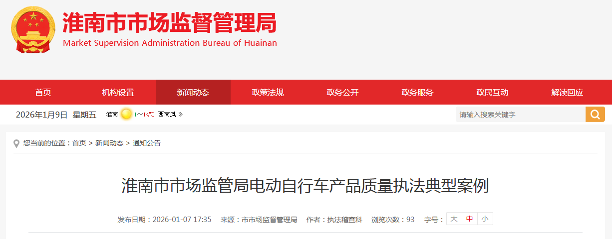 安徽省淮南市市场监管局电动自行车产品质量执法典型案例
