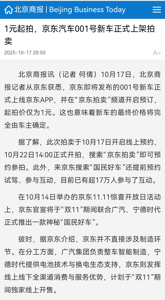 北京商报讯(记者何倩)10月17日,北京商报记者从京东获悉,京东即将发布的001号新车正式上线京东 APP,并在"京东拍卖"频道开启预订,起拍价仅为1元。这也意味着新车的最终价格将完全由车主确 定。 据了解,此次拍卖于10月17日开启线上预约,10月22日14:00正式开拍,搜索"京东拍卖"即可预约参 拍。此外,来京东搜索"国民好车"还提前预约试驾、参与互动,目前已有超17万人参与了互动。 彼时,据京东介绍,京东并不直接涉及制造环节。在分工方面,广汽集团(601238)负责整车智能制 造,宁德时代提供电池技术与换电生态支持,京东则发挥线上线下(300959)全渠道消费与服务优势, 计划于"双11"期间独家线上开售。 在10月14日举办的京东11.11惊喜开放日活动上,京东官宣将于"双11"期间联合广汽、宁德时代 (300750)正式推出一款神秘"国民好车"。 ...
