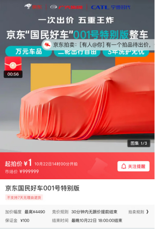 京东1元起拍001号新车,10月22日正式开拍