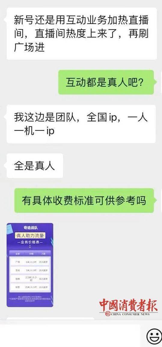 这一抢购场景 在直播间内已是司空见惯 然而 "只剩最后500单!" "3、2、1,上链接!" ...... 当前 不少平台已开启"双11"大促 部分商家和主播 通过伪造 销量、互动与在线人数等数据 刻意制造商品"热销"假象 还有一些公司 "代刷"业绩 俨然形成一条完整的灰色产业链 来看《中国消费者报》记者调查 ↓ 0 1、销量、点赞、弹幕,均能"定制" "想要多少销量、多少互动,都可以定制,价格实惠,效果逼真。"在社交平台上,有人发布相关广告。 近期,记者以提升直播间数据为由,在社交平台轻松联系上提供"直播间数据优化"服务的代刷公司。这些公司的服务覆盖广,从单品销量、点赞、弹幕互 动等基础项,到真人进入直播间、停留时长、定制发言,甚至指定时间点爆发式评论,均可实现。实际服务过程中,代刷公司称会通过两类核心操作达成 目标: 使用软件或真人刷手批量发送指定内容的弹幕,如"好用""回购""什么时候上福利"等,营造积极讨论的氛围; 大量刷点赞数量,提升直播间热度权重。 | AMXDANY F | | --- | | 真人助力流量 | | 业务价格表 | | 价格 人数 业务 | | 广场 6米/人小时 20人起步 | ...