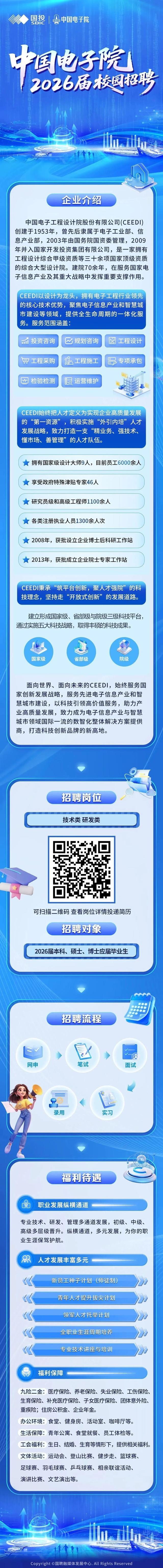 公司概况与核心业务 - 公司为一家拥有70余年历史的综合大型设计院,在服务国家电子信息产业及重大战略中发挥重要支撑作用[3] - 公司以设计为龙头,在电子工程行业拥有领先的核心技术优势,聚焦电子信息产业和智慧城市建设领域,提供全生命周期的一体化服务[3] - 一体化服务范围涵盖工程设计、投资咨询、规划咨询、专项承包、工程采购、工程施工、检验检测及运营维护[3] 人才与科研实力 - 公司将人才定义为实现高质量发展的“第一资源”,积极实施“外引内培”人才发展战略[3] - 公司拥有员工6000余人,其中包括国家级设计大师9人,享受政府特殊津贴专家46人,研究员级和高级工程师1100余人,各类注册执业人员1300余人次[3] - 公司于2008年获批设立企业博士后科研工作站,2013年获批成立企业院士专家工作站[4] - 公司建立形成国家级、省部级与院级三级科技平台,通过实施五大科技战略取得丰硕科技成果[4] 发展战略与愿景 - 公司秉承“筑平台创新,聚人才强院”的科技理念,坚持走“开放式创新”的发展道路[4] - 公司致力于服务国家创新发展战略,服务先进电子信息产业和智慧城市建设,以科技引领高价值服务[4] - 公司愿景是成为电子信息产业与智慧城市领域国际一流的数智化整体解决方案提供商,打造科技创新品牌的新高地[4] 人才招聘与发展 - 公司招聘对象为2026届本科、硕士、博士应届毕业生,岗位包括技术类和研发类[5] - 公司提供专业技术、研发、管理多通道发展路径,包含初级、中级、高级多层级晋升体系[6] - 人才发展计划包括新员工种子计划(师徒制)、青年人才提升拔尖计划、领军人才托举计划以及全职业生涯周期培养[6] 员工福利与保障 - 公司提供“九险二金”福利保障,涵盖医疗保险、养老保险、失业保险、工伤保险、生育保险、补充医疗保险、子女医疗保险、团体意外险、重疾险、住房公积金及企业年金[7] - 办公与生活保障包括食堂、健身房、活动室、咖啡厅、青年公寓、员工体检等[7] - 工会福利覆盖生日、结婚、生育等情形,并定期组织运动会、登山比赛、球类比赛、相亲联谊、文艺演出等文体活动[7]