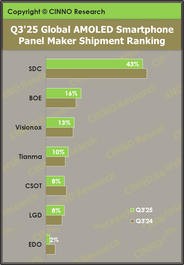 智通财经APP获悉,CINNO Research首席分析师周华Charley表示,随着第三季度传统销售旺季的到 来,苹果及国内主流品牌密集发布旗舰新品,显著拉动OLED面板的市场需求。根据CINNO Research统 计数据,2025年第三季度全球AMOLED智能手机面板出货量约2.5亿片,同比增长11.7%,环比增长 20.3%,实现同比与环比双增长,市场景气度持续回升。 数据来源:CINNO Quarterly Mobile Phone Panel Value Chain Report 分地区来看,2025年第三季度全球AMOLED智能手机面板韩国地区出货量份额占比51.6%,同比下降 0.8个百分点,环比上升4.2个百分点,环比回升主要得益于苹果新机备货的短期拉动;国内厂商出货份额 占比48.4%。 从市场格局来看,三星显示(SDC)AMOLED智能手机面板出货量同比增长7.1%,市场份额由去年同期的 45.2%缩窄至43.4%,市场份额同比下滑1.8个百分点,尽管SDC在LTPO背板的技术优势仍支撑其高端市 场地位,但中端市场订单流失加剧;京东方(BOE)AMOLED智能手机面板出货量同比增长30. ...