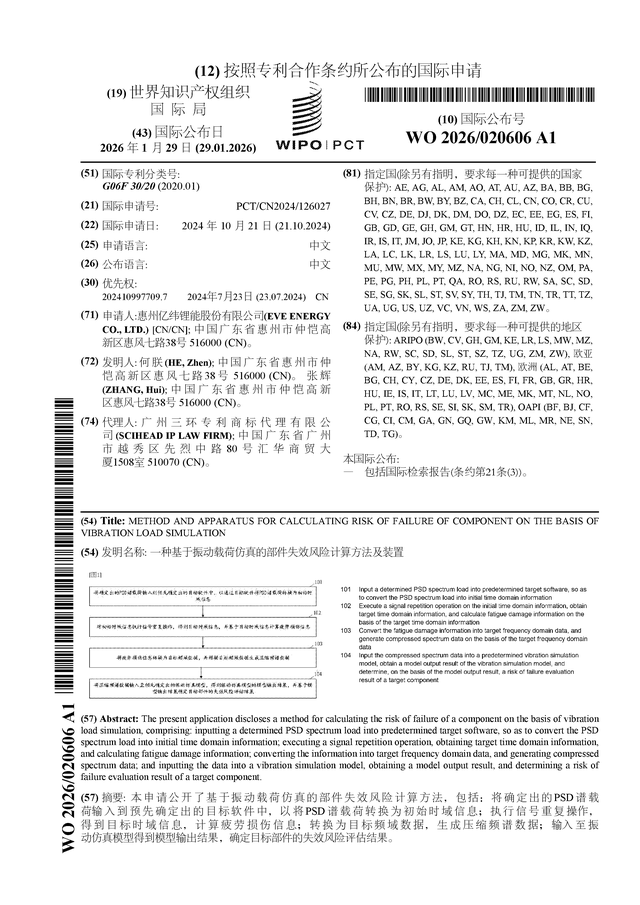 亿纬锂能公布国际专利申请:“一种基于振动载荷仿真的部件失效风险计算方法及装置”