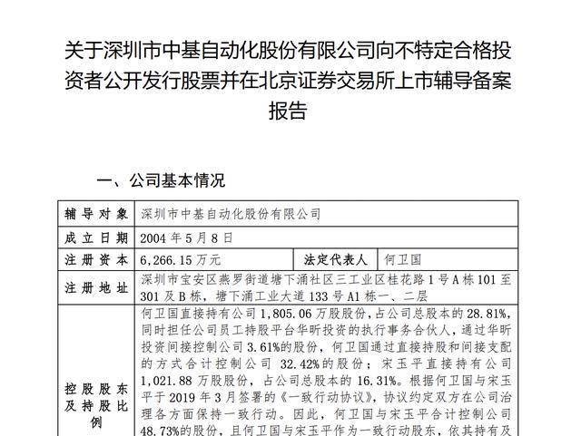 公司基本情况 - 公司全称为深圳市中基自动化股份有限公司,成立于2004年5月8日,注册资本为6266.15万元 [1] - 公司注册地址位于深圳市宝安区,法定代表人为何卫国 [1] - 公司已完成IPO辅导备案,计划在北京证券交易所上市,辅导机构为国联民生证券承销保荐有限公司 [1] 股权结构与控制权 - 控股股东及实际控制人为何卫国与宋玉平,两人为一致行动人 [1][5][6] - 何卫国直接持股28.81%,并通过员工持股平台华昕投资间接控制3.61%的股份,合计控制公司32.42%的股份 [1][5] - 宋玉平直接持股16.31%,两人合计控制公司48.73%的股份 [1][6] - 何卫国现任公司董事长兼总经理,宋玉平现任公司董事兼副总经理 [7] 主营业务与产品 - 公司主要从事锂电池自动化生产设备的研发、设计、生产和销售 [2] - 业务专注于锂电池生产的电芯装配(中段)和电芯检测(后段)环节 [2] - 主要产品类型包括自动化产线和智能化专机,可应用于圆柱、软包和方形等多种形态的电池生产 [2] 历史财务表现 - 2022年至2024年,公司营业收入分别为6.44亿元、8.53亿元和7.54亿元 [2] - 2022年至2024年,归属于挂牌公司股东的净利润分别为1497.17万元、3555.36万元和2888.05万元 [2] 近期经营业绩(2025年上半年) - 2025年上半年营业收入为1.7亿元,较上年同期的3.99亿元大幅减少57.33% [2][3] - 2025年上半年出现净亏损4762.46万元,上年同期为盈利229.92万元 [2][3] - 2025年上半年扣除非经常性损益后的净利润为-5341.02万元,上年同期为-476.01万元 [3] - 尽管营收和利润下滑,但2025年上半年毛利率为24.81%,较上年同期的20.18%有所提升 [2][3] 管理层背景 - 董事长兼总经理何卫国出生于1967年2月,本科学历,拥有丰富的机械和自动化行业经验,曾任职于国营建昌机器厂、通茂电子、新松机器人等企业 [7] - 董事兼副总经理宋玉平出生于1969年11月,高中学历,同样出身于国营建昌机器厂,并曾在珠海明科有限公司任职 [7]