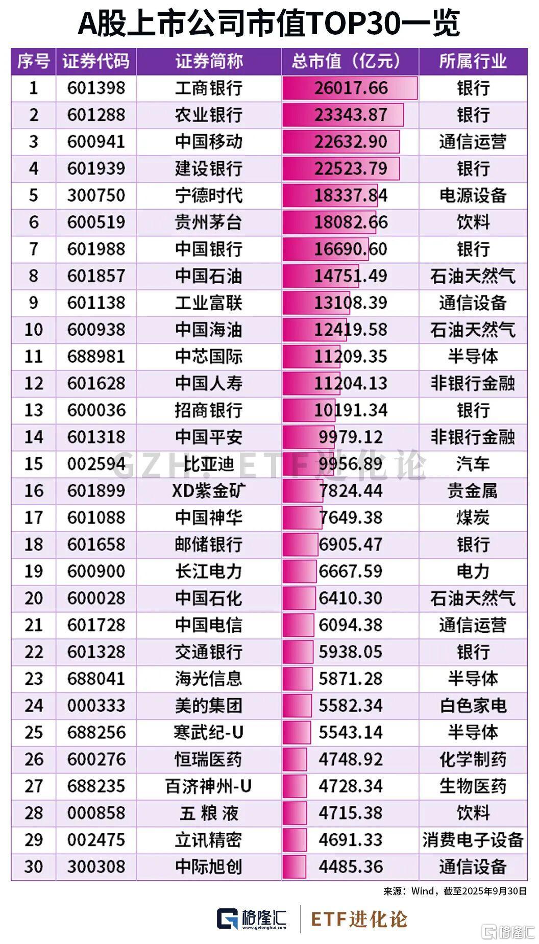 兄弟姐妹们,终于盼来了假期啊啊啊啊啊! 节前最后一个交易日全线收红,上证指数定格在3882.78点,节后继续冲3900点,9月今日完美收官!!! 老规矩,今天先来盘点一下ETF市场9月的"牛熊榜",以及ETF资金的变化,明日继续给大家奉上更重磅的月度、季度数据哦! 今日宁德时代凭借18337.84亿元的总市值正式超越贵州茅台,资本市场含"科"还在继续上升。 | 序号 | 证券代码 | 证券简称 | 总市值(亿元) | 所属行业 | | --- | --- | --- | --- | --- | | I | 601398 | 工商银行 | 26017.66 | 银行 | | 2 | 601288 | 农业银行 | 23343.87 | 银行 | | ਤੇ | 600941 | 中国移动 | 22632.90 | 通信运营 | | 4 | 601939 | 建设银行 | 22523.79 | 银行 | | 5 | 300750 | 宇德时代 | 18337.84 | 电源设备 | | 6 | 600219 | 贵州茅台 | 18082.66 | 饮料 | | 7 | 601988 | 中国银行 | 16690.6 ...