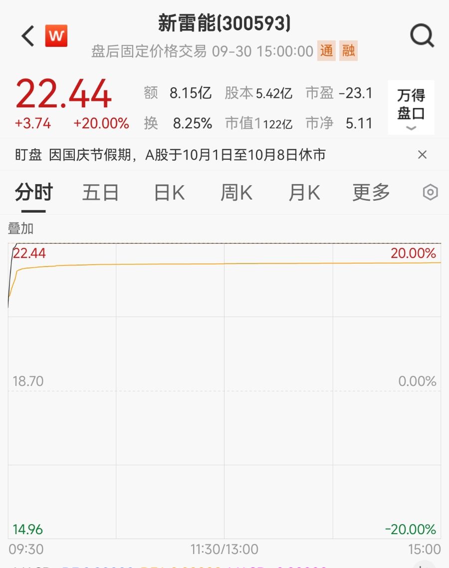 9月30日,特种电源龙头新雷能(300593)(300593.SZ)20CM涨停封板,收盘报22.44元/股,市值122亿元。 消息面上,9月29日晚间,新雷能披露限制性股票激励计划(草案),拟向激励对象授予限制性股票数量不超过705万股,约占公司 股本总额的1.30%。其中首次授予605万股,授予对象为283名核心骨干员工。限制性股票授予价格为9.15元/股,相较9月29日 18.70元的收盘价打了约"5折"。此外,公司同时公告拟推2025年员工持股计划。 对于设置该项激励的目的,公司表示,此举意在建立长期激励机制,吸引和留住优秀人才,将股东利益、公司利益与核心团队 个人利益相结合,推动公司长远发展。 值得注意的是,根据披露,授予的限制性股票来源于定向发行或二级市场回购。如涉及股票回购,是否会影响公司现金流?21 财经.南财快讯记者就此以投资者身份致电新雷能,接线工作人员回应称,目前公司已经完成相应的股票回购,不影响后续现金 流。 不过,从当前的现金流情况来看,新雷能似乎也面临着一定的资金压力。半年报显示,2025年上半年公司经营活动现金流净额 为-6917万元,同比减少37.80%。对此,上述工作人员向记 ...