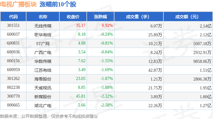 从资金流向上来看,当日电视广播板块主力资金净流入5167.45万元,游资资金净流出690.19万元,散户 资金净流出4477.27万元。电视广播板块个股资金流向见下表: | 代码 | 名称 | 收盘价 | 涨跌幅 | 成交量(手) | 成交额(元) | | --- | --- | --- | --- | --- | --- | | 600996 | 盖广网络 | 9.79 | 5.27% | 56.89万 | 5.44亿 | | 000665 | 湖北广电 | 6.16 | 4.05% | 53.39万 | 3.28亿 | | 626109 | 吉视传媒 | 3.77 | 2.45% | 413.11万 | 15.65 Z | | 600637 | 东方明珠 | 10.31 | 1.58% | 138.37万 | 14.13亿 | | 834021 | 流金科技 | 6.84 | 1.33% | 4.19万 | 2853.67万 | | 600831 | ST广网 | 6677 | 1.22% | 18.23万 | 8974.63万 | | 300770 | 新媒股份 | 47.60 | 0.98% | 3. ...