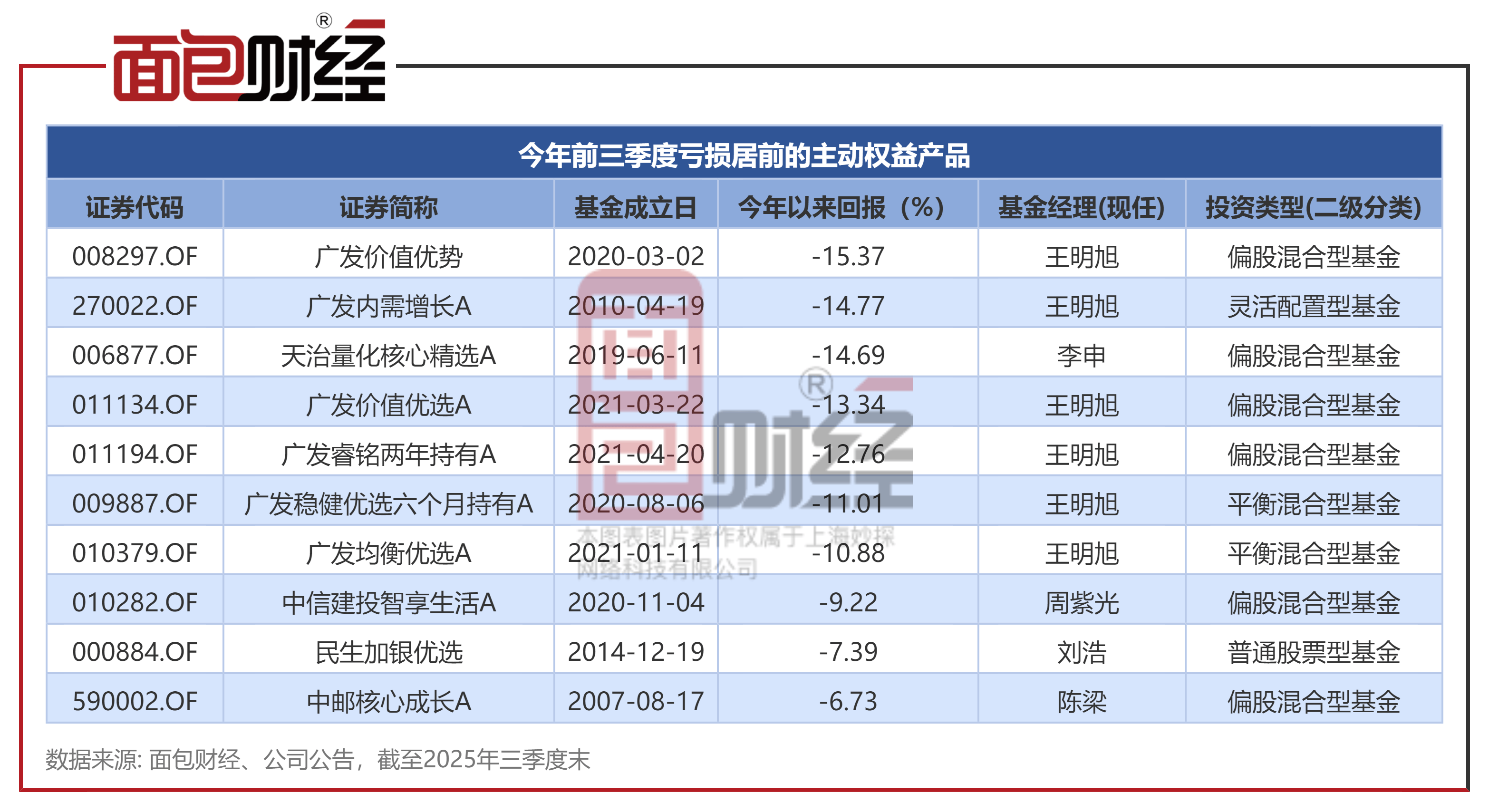 核心观点 - 2025年前三季度A股市场震荡上涨,但广发基金旗下基金经理王明旭管理的多只主动权益基金逆势深度亏损,其管理的六只产品年内亏损均超过10%,其中广发价值优势以-15.37%的净值增长率在全市场主动权益基金中排名倒数第一 [1][4] - 王明旭的投资风格偏重低估值蓝筹股,二季度末在白酒、城商行等板块配置较多,但其调仓未能踏准2025年市场偏向成长股(如医药、科技)的节奏,导致业绩大幅跑输基准和同类产品 [7][8] - 广发基金作为基金管理人,面临旗下产品大幅亏损却仍能收取管理费所带来的公司利益与投资者利益一致性质疑,以及市场对其投研风控能力是否存在漏洞的关注 [1][9][11]   市场表现与业绩 - 2025年前三季度A股市场主要指数普遍呈现震荡上涨趋势 [1] - 公募基金市场大部分主动权益类基金实现盈利,同期亏损的主动权益基金不足100只,其中仅7只基金净值回撤超过10% [1] - 广发基金王明旭管理的产品占据了前述7只深度亏损基金中的六席 [1] - 广发价值优势前三季度净值增长率为-15.37%,跑输业绩比较基准超过28个百分点,排名市场倒数第一 [1][4] - 广发内需增长A前三季度净值下跌14.77%,跑输业绩比较基准约24个百分点 [6] - 王明旭管理的另外四只基金(广发价值优选A、广发睿铭两年持有A、广发稳健优选六个月持有A、广发均衡优选A)前三季度净值回撤均超过10%,跑输业绩比较基准超过20个百分点 [6]   投资策略与配置 - 基金经理王明旭的投资风格偏重低估值及蓝筹大盘股 [7] - 2025年二季度末,其基金前十大重仓股包括美的集团、江苏银行、贵州茅台、杭州银行、泸州老窖等,在白酒、城商行板块配置较多 [7] - 王明旭在基金中报中表示,二季度减持了地产、券商等行业,增持了财报领先的城商行及估值处于历史低水平的高端白酒,并建仓了部分软件开发及IT服务公司 [7]   公司相关情况 - 广发基金管理有限公司成立于2003年8月5日,坚持“专业创造价值、客户利益为上”的理念 [11] - 王明旭旗下多只亏损基金成立于2020-2021年市场高位期,其管理规模曾一度突破百亿元 [9] - 市场关注点在于,基金管理人在产品大幅亏损情况下依然实现“旱涝保收”,其利益是否与投资者一致,以及投研能力是否有待提高 [1][11]