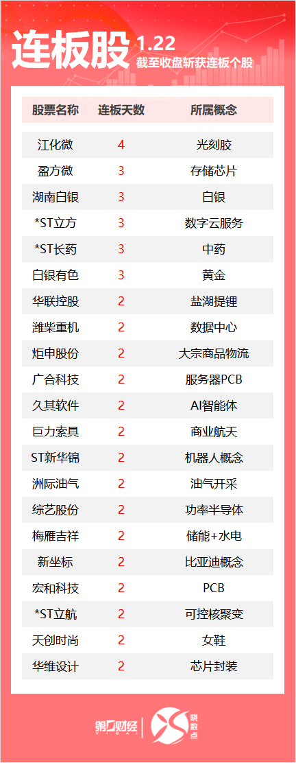 市场连板股概况 - 2025年1月22日,A股市场共有94只个股涨停,其中有多只个股实现连续涨停[1] - 实现4连板的个股为光刻胶概念股江化微[1] - 实现3连板的个股包括存储芯片概念股盈方微、白银股湖南白银、数字云服务概念股*ST立方、中药概念股*ST长药以及重要概念股日银有色[1] 连板个股详情(按连板数分组) - **4连板个股**:江化微,所属概念为光刻胶[1] - **3连板个股**:盈方微(存储芯片)、湖南白银(白银)、*ST立方(数字云服务)、*ST长药(中药)、日银有色(重要)[1] - **2连板个股**:华联控股(盐湖提锂)、潍柴重机(数据中心)、炬申股份(大宗商品物流)、广合科技(服务器PCB)、久其软件(AI智能体)、巨力索具(商业航天)、ST新华锦(机器人概念)、洲际油气(油气开采)、综艺股份(功率半导体)、梅雁吉祥(储能+水电)、新坐标(比亚迪概念)、宏和科技(PCB)、*ST立航(可控核聚变)、天创时尚(女鞋)[1] 热门概念板块分布 - **半导体与电子**:光刻胶、存储芯片、服务器PCB、功率半导体、PCB、芯片封装等概念活跃,代表公司有江化微、盈方微、广合科技、综艺股份、宏和科技、华维设计[1][2] - **资源与能源**:白银、盐湖提锂、油气开采、重要等概念受到关注,代表公司有湖南白银、日银有色、华联控股、洲际油气[1] - **科技与高端制造**:数字云服务、数据中心、AI智能体、商业航天、机器人概念、可控核聚变等概念表现突出,代表公司有*ST立方、潍柴重机、久其软件、巨力索具、ST新华锦、*ST立航[1] - **新能源与汽车**:储能+水电、比亚迪概念等概念有个股连板,代表公司有梅雁吉祥、新坐标[1] - **其他领域**:中药、大宗商品物流、女鞋等领域也有个股实现连板,代表公司有*ST长药、炬申股份、天创时尚[1]