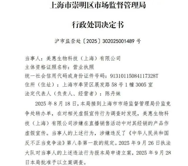 事件概述 - 益生菌品牌菌小宝的电商渠道经销商美惠生物科技(上海)有限公司因虚假宣传被上海市崇明区市场监督管理局处以3万元人民币罚款 [1][2] - 经销商在直播中宣传其普通食品产品“太空30号”具有治疗妇科炎症、改善异味等功效,相关宣传内容被监管部门认定为虚假 [2] 涉事主体与关系 - 受罚主体为美惠生物科技(上海)有限公司,该公司是上海菌小宝健康科技有限公司“菌小宝系列”产品在电商渠道的经销商 [2] - 美惠生物科技(上海)有限公司成立于2013年,注册资本为100万元人民币 [4] - 品牌方上海菌小宝健康科技有限公司成立于2019年,注册资本为20025万元人民币,法定代表人为涂醉桃 [5] - 菌小宝品牌隶属于晨冠集团,该集团始于2002年,业务涵盖乳业、奶粉及益生菌等产品 [7] - 菌小宝品牌代言人为贾乃亮 [5] 违规行为详情 - 2025年6月18日,经销商通过有赞平台的“菌小宝官方旗舰店”进行直播,宣传“太空30号”产品为“女性专属的,守护我们女性私密花园的超强卫士”,并声称“10天会让你的整个环境有非常强的改善,包括有一些炎症、异味”、“外阴白斑引起的外阴瘙痒有用的”、“有妇科炎症的困扰……10天见效,30天巩固”等内容 [2] - 经监管部门查证,“太空30号”产品为普通食品,不具有其所宣称的治疗功效,以上宣传内容为虚假 [2] 事件处理过程 - 2025年9月25日,涉事经销商提交了整改报告并改正了违法行为 [2] - 2025年9月28日,该公司被立案调查 [2] - 2025年12月3日,该公司被处以3万元人民币罚款 [2] 相关方回应 - 菌小宝官方旗舰店客服回应称,益生菌并非药品,只能辅助使用 [1][4][5] - 截至新闻报道时,记者多次致电及发送采访邮件至菌小宝官方及其母公司晨冠集团,均未获得回应 [1][4]