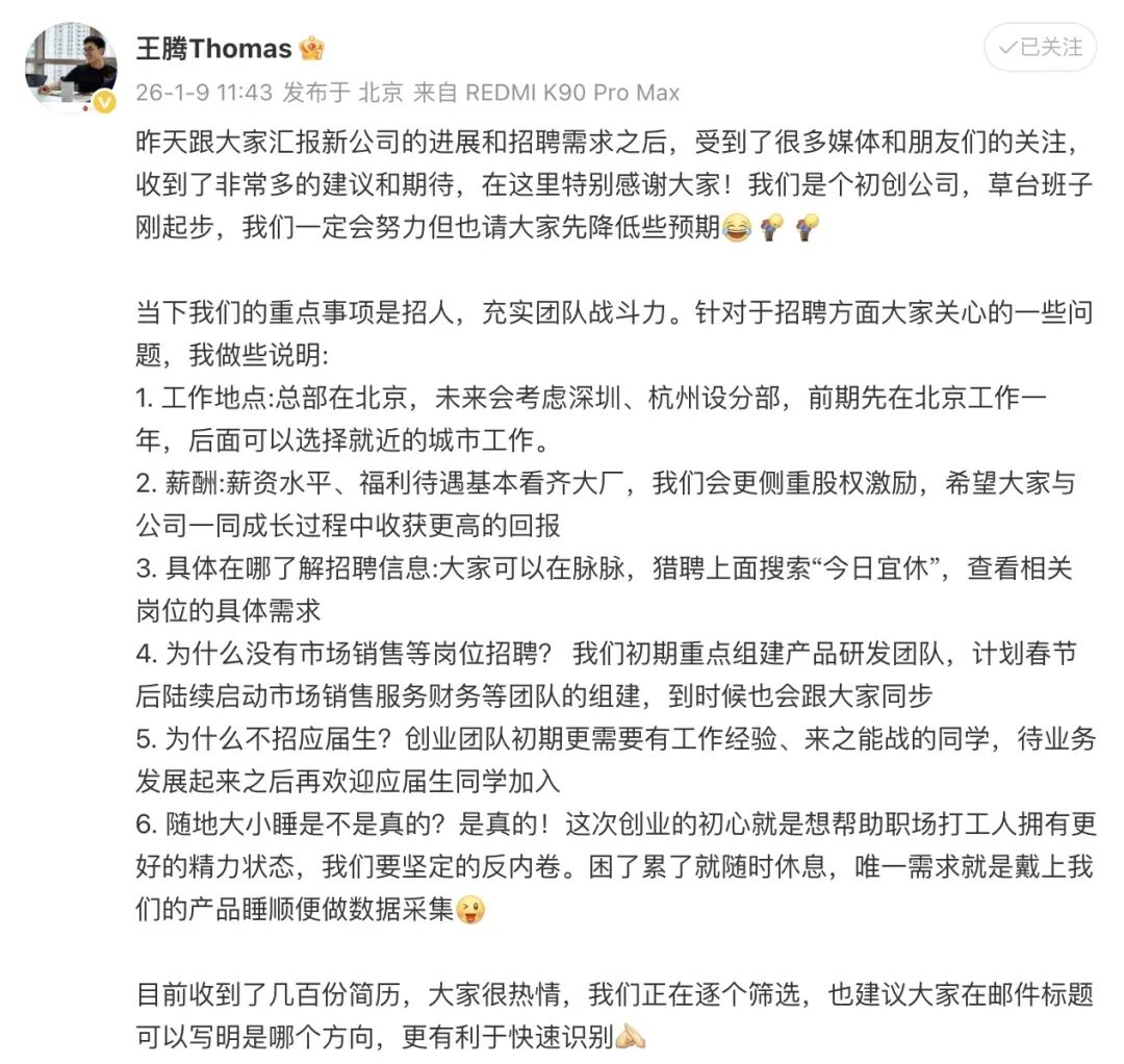 公司概况与创业背景 - 前REDMI总经理王腾离开小米后创立新公司“今日宜休” [1][3] - 公司目标是通过研发睡眠健康相关产品,帮助职场打工人拥有更好的精力状态,并坚定地反内卷 [1][4] - 公司创业初心是倡导“随地大小睡”,即困了累了可随时休息,同时使用其产品进行睡眠数据采集 [1][4] 产品与业务战略 - 公司核心业务是研发睡眠健康产品,产品需佩戴使用并兼具数据采集功能 [1][4] - 公司初期战略重点为组建产品研发团队,计划在春节后陆续启动市场、销售、服务及财务等团队的组建 [1][4] 团队建设与招聘进展 - 公司当前重点事项是招聘,以充实团队战斗力,目前已收到几百份简历并正在逐个筛选 [1][4] - 招聘主要通过脉脉、猎聘平台进行,可搜索“今日宜休”查看具体岗位需求 [1][4] - 公司初期招聘更侧重有工作经验、能快速投入工作的候选人,暂不招收应届生,待业务发展后再欢迎其加入 [1][4] 组织架构与薪酬体系 - 公司总部设在北京,计划前期在北京工作一年,未来会考虑在深圳、杭州设立分部,员工后续可选择就近城市工作 [1][4] - 公司提供的薪资水平与福利待遇基本看齐大型互联网公司,并更侧重通过股权激励使员工与公司共同成长并获得更高回报 [1][4]