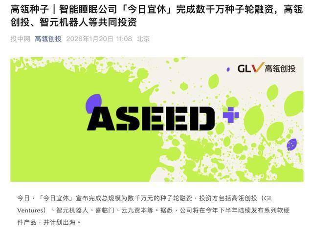 公司融资与背景 - 睡眠健康品牌“今日宜休”完成总规模为数千万元人民币的种子轮融资 [1] - 本轮投资方包括高瓴创投、智元机器人、喜临门、云九资本等知名机构 [1] - 公司创始人王腾为前小米高管,曾担任REDMI品牌总经理及小米中国区市场部总经理,主导过Mix2、小米8、红米Note7等产品 [4] 公司战略与产品规划 - 公司计划于2024年下半年陆续发布系列软硬件产品 [4] - 公司有明确的出海计划 [4] - 公司目标是通过研发睡眠健康相关产品,帮助用户改善睡眠质量,从而获得更好的精力状态 [4][5] 行业与市场洞察 - 睡眠与精力管理已成为普遍关注的大众健康问题,工作与生活压力导致睡眠质量差、精力不足的现象非常普遍 [6] - 社会对睡眠价值的理解仍有待提升,睡眠的作用及睡眠不足的风险等知识尚未普及 [6] - 人工智能大模型的快速发展为产品体验带来巨大提升空间,通过结合传感器与大模型,可主动感知用户状态并进行干预,使睡眠改善和精力管理成为可能 [6]
