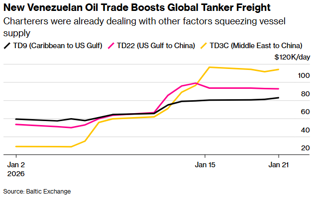 全球油轮运费飙升 - 美国加强对委内瑞拉石油流向的控制 导致全球原油油轮运费呈现更广泛的飙升态势[1] - 委内瑞拉石油贸易此前主要由一支由老旧船舶组成的“影子舰队”负责[1] - 船东预期对船只需求将增加 正将合规油轮部署在美国墨西哥湾附近 而非停留在中东等主要产油枢纽周边海域[1] 主要航线运费变化 - 今年以来 中东至中国航线的每日收益几乎翻了三倍 达到近114,000美元[4] - 从美国墨西哥湾到中国的运费上涨了73%[4] - 从加勒比地区前往美国墨西哥湾的船只收益于周三创下近两年新高 达到约82,800美元[4] 船舶调度与市场行为 - 一艘名为“梅根荣耀号”的空载油轮在完成交付后 从中东开启前往美洲的45天航程 前往美国墨西哥湾等待指令[4] - 此类船舶调度举动促使租船方在不涉及美洲的航线上抛出更高昂的费用以运送近期货物[4] - “阿尔里卡号”以140点的世界油轮运费指数成交 创下年内新高 计划于2月初将科威特原油运往新加坡[4]