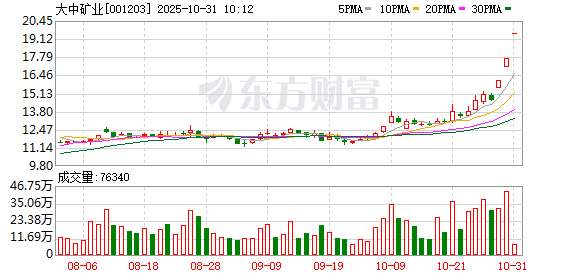 近日该股表现 大中矿业盘中涨停,已连收3个涨停板,截至9:26,该股报19.50元,换手率0.29%,成交量369.65万股, 成交金额7208.19万元,涨停板封单金额为2.72亿元。连续涨停期间,该股累计上涨33.11%,累计换手 率为6.11%。最新A股总市值达294.06亿元,A股流通市值251.61亿元。 龙虎榜数据显示,该股因连续三个交易日内,涨幅偏离值累计达20%上榜龙虎榜1次,买卖居前营业部 中,机构净买入546.53万元,深股通累计净买入2806.14万元,营业部席位合计净买入1.25亿元。 公司发布的三季报数据显示,前三季公司共实现营业收入30.25亿元,同比增长1.60%,实现净利润5.94 亿元,同比下降10.28%,基本每股收益为0.3900元,加权平均净资产收益率9.08%。(数据宝) | 日期 | 当日涨跌幅(%) | 换手率(%) | 主力资金净流入(万元) | | --- | --- | --- | --- | | 2025.10.30 | 9.99 | 3.36 | 3967.98 | | 2025.10.29 | 10.03 | 2.46 | 11800.09 | | 2 ...