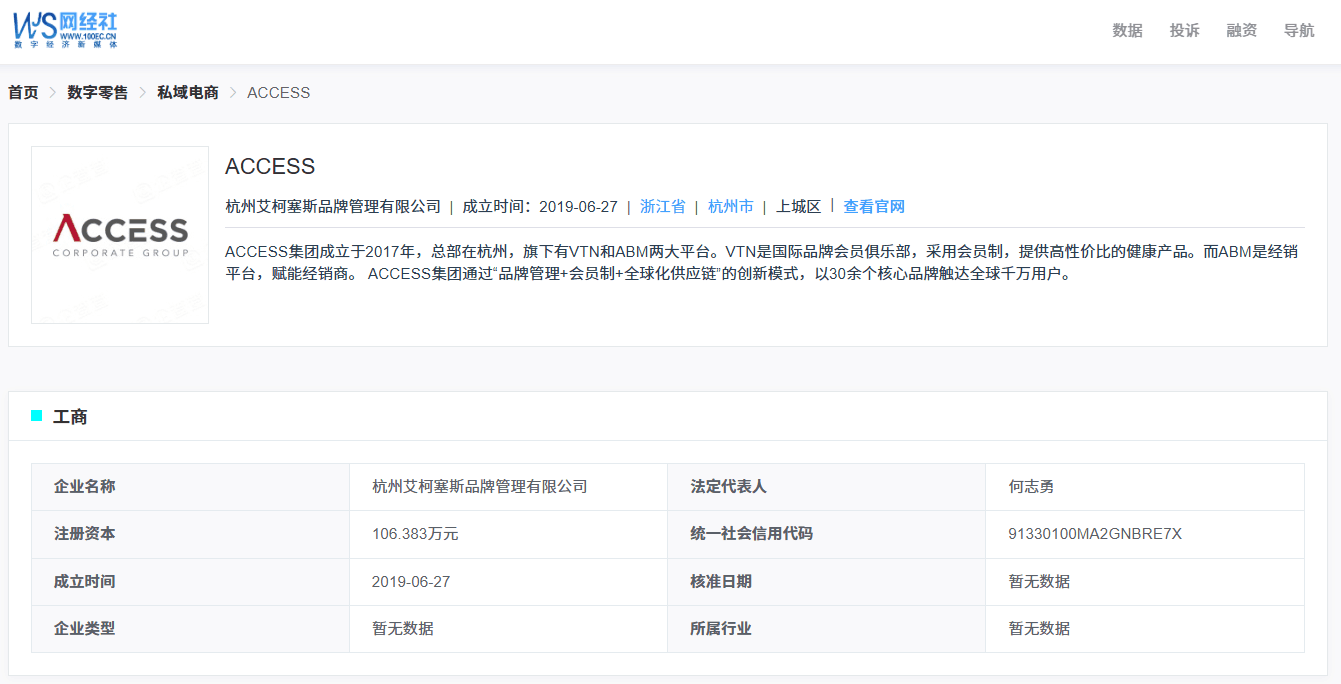 | | ACCESS | | --- | --- | | Access | 杭州艾柯塞斯品牌管理有限公司 成立时间:2019-06-27 浙江省 杭州市 上城区 查看官网 | | CORPORATE GROU | ACCES$集团成立于2017年,总部在杭州,旗下有VTN和ABM两大平台。VTN是国际品牌会员俱乐部,采用会员制,提供高性价 | | | 平台,赋能经销商。 ACCESS集团通过"品牌管理+会员制+全球化供应链"的创新模式,以30余个核心品牌触达全球千万用户。 | | 企业名称 | 杭州艾柯塞斯品牌管理有限公司 | 法定代表人 | 何志勇 | | --- | --- | --- | --- | | 注册资本 | 106.383万元 | 统一社会信用代码 | 91330100MA | | 成立时间 | 2019-06-27 | 核准日期 | 暂无数据 | | 企业类型 | 暂无数据 | 所属行业 | 暂无数据 | 在创始人何志勇的领导下,Access集团迅速发展为控股21个国际品牌、合作超200个全球健康美丽品牌的行业新锐。截至2025年,VTN已吸引全球33个国家 和地区的800万注册用户,其中超 ...