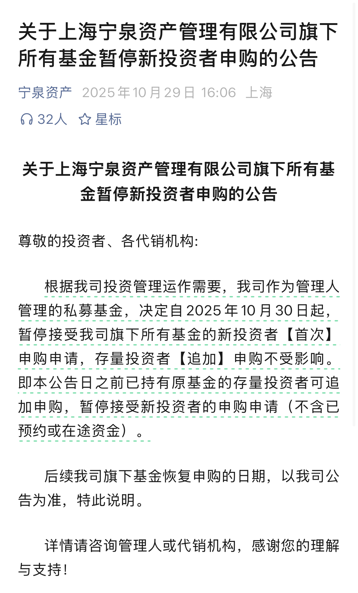 暂停新投资者申购!百亿私募宁泉资产“封盘”
