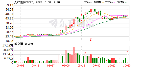 10月30日盘中科创板股沃尔德涨停,截至13:55,股价报53.96元,成交7.94亿元,换手率10.61%,振幅 18.41%。 融资融券数据显示,该股最新(10月29日)两融余额为5.53亿元,其中,融资余额为5.53亿元,较上一 个交易日增加304.68万元,增幅为0.55%;近10日两融余额合计增加4774.24万元,增幅为9.46%,其间 融资余额增长9.46%。 10月30日公司发布的三季报数据显示,前三季公司共实现营业收入5.39亿元,同比增长9.05%,实现净 利润7140.34万元,同比下降6.67%。(数据宝) 科创板个股中,截至发稿上涨的有205只,下跌的有378只,上市5日内的C奕材-U、C禾元-U、C必贝特- U等,涨幅较高的有C奕材-U、C必贝特-U、C禾元-U,涨幅为12.90%、5.52%、1.65%,其余科创板个 股中,涨幅居前的有沃尔德、国盾量子、纬德信息等,分别上涨19.99%、16.63%、16.15%,跌幅居前 的有敏芯股份、鼎通科技、理工导航等,分别下跌12.00%、9.81%、9.27%。 资金面上,沃尔德上一交易日主力资金净流出2146.67万元,近5日净流入4 ...