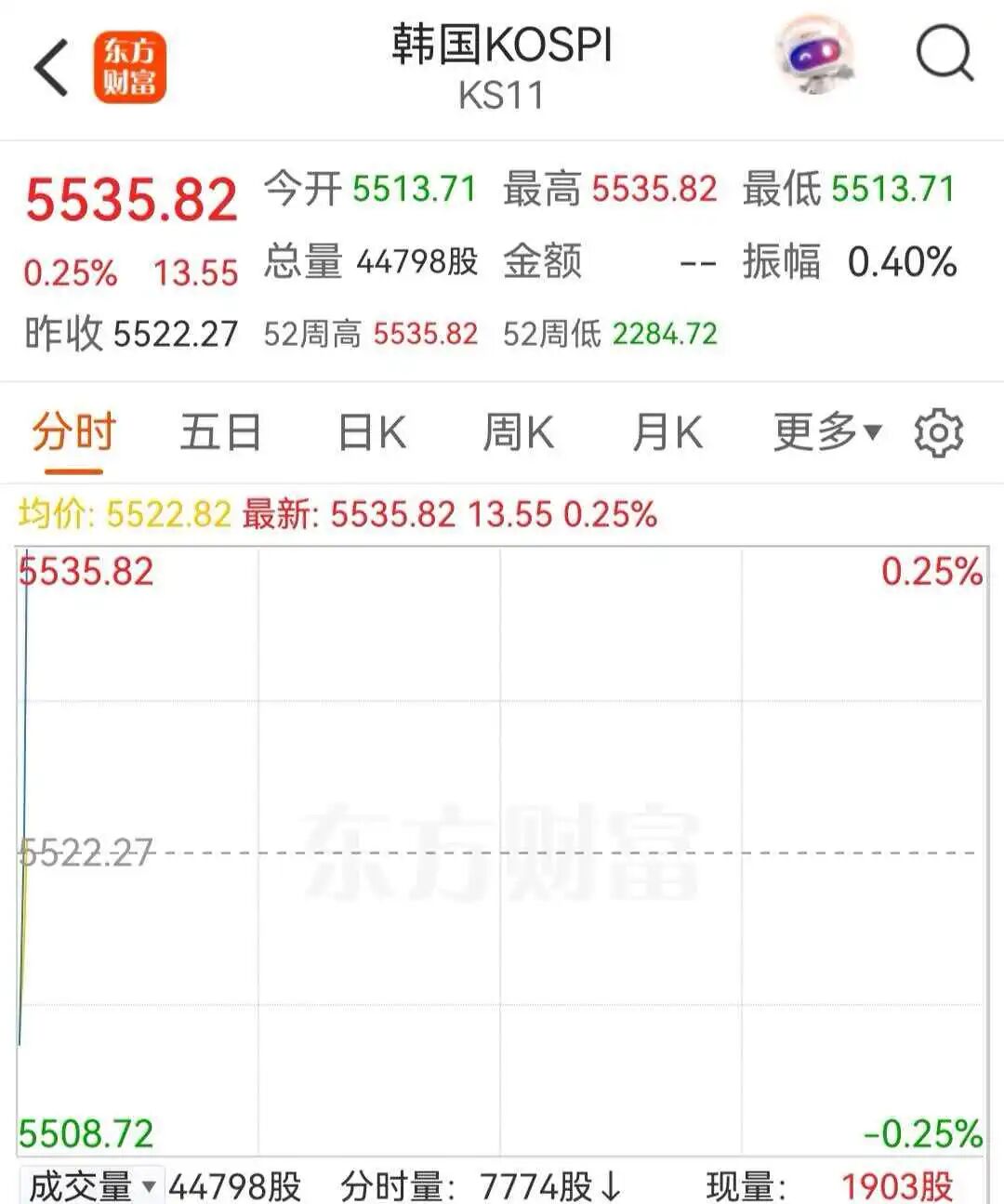 日韩股市低开,日经225指数跌0.44%,韩国KOSPI指数直线拉升翻红丨日韩股市