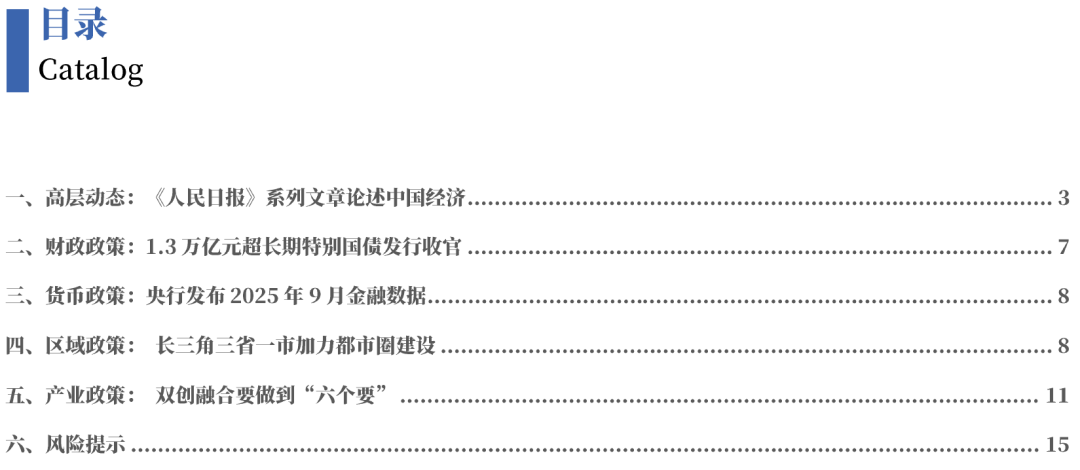 炒股就看金麒麟分析师研报,权威,专业,及时,全面,助您挖掘潜力主题机会! 10月上半月,重点关注四方面政策:高层动态方面,关注《人民日报》系列评论文章;宏观政策方面,关注超长期特别国债发行;区域方面,关注长三角 三省一市都市圈同城化建设;产业方面,关注服务型制造创新发展。 高层动态:《人民日报》系列评论文章论述中国经济。(1)国庆期间,《人民日报》连续推出系列评论文章,围绕"经济形势怎么看、经济工作怎么 干",深入系统阐述中国经济长期稳定发展的内在逻辑,以及中国发展之于世界的机遇性和确定性,传递出稳预期、强信心、促发展的强烈信号。(2)习 近平出席全球妇女峰会开幕式并发表主旨讲话。(3)国务院以"强化标准引领保障作用,以标准升级促进经济高质量发展"为主题的国务院第十六次专题 学习。(4)李强总理赴平壤出席朝鲜劳动党建党80周年庆祝活动并对朝鲜进行正式友好访问。 财政政策:1.3万亿元超长期特别国债发行收官。10月9日,财政部公开《关于公布2025年第四季度国债发行有关安排的通知》,明确今年第四季度超长期 特别国债发行安排,意味着2025年1.3万亿元超长期特别国债于10月14日完成发行。2025年共发行了20 ...