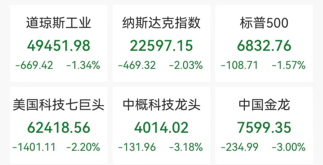 科技股表现 - 科技股集体下跌,思科股价重挫超13%,领跌板块,其最新财报显示内存价格持续飙升令业绩承压,季度毛利率低于预期 [2] - 苹果股价下跌5%,脸书下跌近3%,特斯拉与亚马逊下跌超2%,英伟达下跌逾1% [2] - 芯片股普遍下跌,费城半导体指数下跌2.5%,迈威尔科技下跌近4%,英特尔、超威半导体、博通下跌超3%,阿斯麦下跌2% [2] 金融股表现 - 银行股全线走低,摩根大通下跌超2%,高盛下跌逾4%,花旗下跌超5%,摩根士丹利下跌近5%,美国银行下跌超2%,富国银行下跌逾3% [2] - 中概股普遍下跌,纳斯达克中国金龙指数下跌3% [2] - 中概股个股方面,腾讯音乐与虎牙下跌超10%,贝壳下跌近6%,爱奇艺下跌超5%,哔哩哔哩下跌近5%,百度集团下跌超4% [2] 能源与原材料 - 能源股集体下跌,埃克森美孚下跌近3%,雪佛龙下跌近2%,斯伦贝谢下跌近2%,西方石油下跌超3% [2] - 国际油价双双下跌,WTI原油期货价格收跌2.77%,报62.84美元/桶,布伦特原油期货价格收跌2.71%,报67.52美元/桶 [3] - 贵金属价格大跌,现货黄金跌破5000美元,尾盘报4920.97美元/盎司,下跌163.153美元,跌幅3.21% [2][3] - 现货白银尾盘跌幅超10%,报75.3美元/盎司 [2],COMEX白银期货下跌8.870美元,跌幅10.57% [3] 加密货币市场 - 加密货币主要币种下跌,比特币下跌近3%,报6.58万美元/枚 [4] - 过去24小时全市场超11万人爆仓 [4] - 以太坊价格报1923.02美元,24小时下跌2.18%,SOL价格报77.29美元,24小时下跌3.30% [5] 宏观与政策环境 - CME“美联储观察”最新数据显示,市场预期美联储到3月维持利率不变的概率为92.2%,降息25个基点的概率为7.8% [6] - 市场预期美联储到6月累计降息25个基点的概率为49.9% [6] - 美国总统特朗普表示,美国“必须”与伊朗达成协议,否则局势将“非常严重”,并警告未来一个月内局势可能迅速发展 [6]