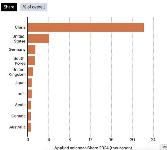 【文/观察者网专栏作者 心智观察所】 二十年前,如果有人预言全球应用科学领域排名前三十的顶尖机构将全部来自同一个国家,这大概会被 视为痴人说梦。然而,这个看似不可能的预言如今已成为现实。 《自然指数》近期发布的首份应用科学榜单犹如一记惊雷,在全球科学界激起千层浪——中国科研机构 不仅包揽了前十名,更是垄断了前三十名的所有席位,直到第三十一名才出现新加坡国立大学的身影。 当中国的贡献分值高达22261,占据全球应用科学产出的56%,而排名第二的美国仅有4099分、占比 10%时,我们不得不正视一个事实:在这场关乎国家竞争力与未来发展的科学竞赛中,攻守之势,已然 互换。 《自然指数》是《自然》旗下极具影响力的学术评估工具,长期以来被视为衡量全球顶尖科研产出的权 威标尺。 此次发布的应用科学榜单,依据的是过去一年间发表在25家应用科学期刊和会议上的文章,涵盖工程 学、计算机科学、食品科学等领域。这些期刊的遴选经过了近4200名研究人员的调查筛选,代表着他们 愿意发表最重要研究成果的学术平台。换言之,这份榜单呈现的是各国在"学以致用"这一科学核心命题 上的真实实力。 榜单的结果令人瞠目。中国科学院毫无悬念地占据榜首, ...