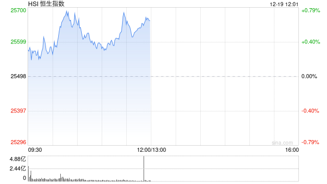 12月19日消息,港股三大指数集体上涨。截至午间收盘,恒生指数涨0.65%,报25663.41点,恒生科技 指数涨1.14%,国企指数涨0.50%。盘面上,科网股涨多跌少,美团涨超2%,网易、百度、腾讯涨超 1%,联想跌超1%;生物医药股普涨,药明康德涨超6%;中资券商股走强,招商证券涨超3%;智能驾 驶概念股活跃,佑驾创新涨超12%;今日智汇矿业、希迪智驾上市,智汇矿业涨超111%,希迪智驾跌 超8%。 | 名称 | | 量新价 | 涨跌幅 √ | | --- | --- | --- | --- | | 恒生科技指数 | N | 5480.00 | +1.14% | | 800700 | | | | | 恒生指数 | NV | 25663.41 | +0.65% | | 800000 | | | | | 国企指数 | Nº M | 8885.67 | +0.50% | | 800100 | | | | 生物医药股普涨,药明康德涨超6%。北京时间12月18日凌晨,参议院官网显示,搭载修订版《生物安 全法案》的美国2026财年国防授权法案(2026NDAA)获通过。新版本生物安全法未具体点名任何一家 公司。有券 ...