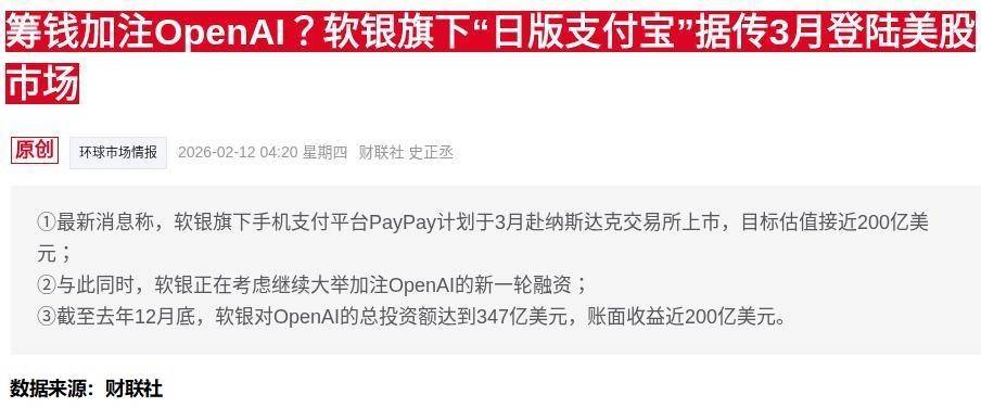 上市计划与财务数据 - PayPay计划本月向美国SEC提交招股书,寻求3月在美国纳斯达克交易所挂牌上市 [3] - 公司目标市值预计超过3万亿日元(约合196亿美元),软银集团计划出售约10%的股份,以实现约10%的自由流通股比例,这是纳入纳斯达克100指数的关键门槛 [3] - PayPay在2023财年实现EBITDA(息税折旧摊销前利润)扭亏为盈 [3] - PayPay 2024财年在日本市场的合并总支付额为15.4万亿日元 [4] 股权结构与市场地位 - PayPay成立于2018年,由软银集团的电信子公司与雅虎日本(现LY Corp.)合资成立,两者合计持有66%的股权,剩余34%由软银旗下愿景2号基金持有 [3] - PayPay目前占据日本智能手机支付市场约7成的份额 [3] 增长战略与业务扩张 - 美股IPO标志着公司转向泛亚洲增长战略,未来将考虑海外业务扩张和潜在并购 [3] - 公司已于2025年在韩国市场启动服务,并与国际信用卡巨头Visa达成合作协议,未来将在美国设立支付服务合资公司 [3] - 公司计划在美国加州等地推出基于二维码结算的加盟店网络,瞄准美国现金结算规模达300万亿日元的巨大市场 [4] 软银的投资背景与动机 - 推动PayPay上市是软银集团获取资金的一种方式 [5] - 软银继去年底向OpenAI一次性注资225亿美元后,近来有消息称其可能在OpenAI下一轮融资中投资高达300亿美元 [5] - 软银迄今对OpenAI的总投资额达到347亿美元,截至去年12月,这笔投资的账面收益预估达到198亿美元 [5] - 软银CFO提及,OpenAI等公司可能会在相对短的时间内走向IPO,软银能通过兑现持仓获得“重大价值” [5] - 若OpenAI上市后估值超过1万亿美元,对目前持有约11%股权的软银将带来巨大的资产价值提升 [5] 行业与市场挑战 - 由于日本严重的老龄化和人口缩减,互联网平台在日本本土的增长“天花板”正不断下沉 [3]