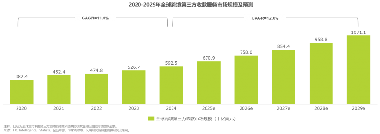 全球跨境电商市场持续扩大,货物贸易占比稳步提升,中国跨境电商市场稳居全球跨境电商主力,出口导向格 局持续强化。全球跨境支付市场已进入实时支付、稳定币与数字货币时代,市场规模稳步扩张,小额高频场景 正推动结构重塑。在这样的背景下,跨境第三方支付服务价值得到突显,其中,中国跨境出口第三方收款服务 市场快速扩容。 近日,艾瑞咨询发布《2025年全球跨境支付服务行业洞察报告》,重点梳理全球及中国跨境第三方收款服务市 场发展情况与竞争格局,阐述服务商在本地化服务、安全稳定性、场景定制化等方面的关键竞争力,并挖掘当 前市场发展机遇。 全球跨境第三方收款服务市场预计将持续增长 根据艾瑞咨询数据,全球跨境第三方收款服务市场预计将持续增长,市场规模由2024年的近6000亿美元扩大至 2029年的超10000亿美元。同期,中国跨境出口第三方收款服务市场规模预计由2024年的4000亿美元增长至 2029年的近7000亿美元。 | | | 传统渠道 (银行电汇、信用卡/借记卡、汇款公司) | | 第三方支付服务商 | | --- | --- | --- | --- | --- | | 操作体验 | 0 | 通常需填写表格/纸质指 ...