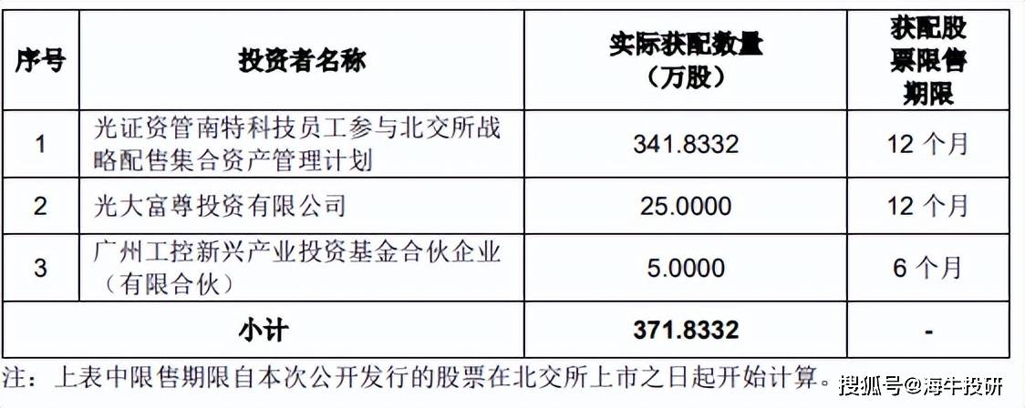 IPO发行结果 - 本次北交所IPO共有63.70万户投资者参与打新,有效申购数量达1001.83亿股,冻结资金约8675.82亿元 [1] - 申购倍数高达2993.66倍,获配比例仅为0.033% [1] - 战略配售环节引入3家战略投资者,分别为光证资管南特科技员工参与北交所战略配售集合资产管理计划、光大富尊投资有限公司、广州工控新兴产业投资基金合伙企业(有限合伙) [1] 战略配售详情 - 战略配售股份合计371.83万股,占本次发行规模的10.00%(不含超额配售部分) [3] - 发行价格为8.66元/股,战略配售募集资金金额合计3220.08万元 [3] - 光证资管南特科技员工资管计划获配341.8332万股,光大富尊投资获配25.0000万股,广州工控新兴产业投资基金获配5.0000万股 [2] - 前两家战投限售期为12个月,第三家战投限售期为6个月 [2] 公司业务与技术 - 公司是主要从事精密机械零部件研发、生产和销售的高新技术企业 [3] - 公司已形成从模具设计、熔炼铸造到精密加工的全套生产工艺,建立了以高性能精密机械零部件产品制备为核心的全流程生产体系 [3] - 产品主要应用于空调零部件和汽车零部件等细分领域 [3] - 在空调零部件领域,公司依靠高水平的加工工艺、微米级(μ级)的加工精度以及快速响应能力获得客户认可 [3] 客户与市场地位 - 在空调压缩机领域,公司与前五强中的四家建立了稳定合作关系,包括美的集团、格力电器、海立股份、松下电器等国内外知名厂商 [4] - 公司先后获得美的集团"优秀供应商"、格力电器"最佳协作奖"、松下电器"优秀供应商"等荣誉 [4] - 在汽车零部件领域,公司积极进行产品迭代升级,压盘、前盖、卡钳等产品已陆续实现对客户送样或量产 [4] 财务业绩表现 - 2022年至2024年,公司营业收入持续增长,分别为8.34亿元、9.38亿元、10.31亿元 [4] - 同期归母净利润显著提升,分别为4664.03万元、8418.82万元、9821.70万元 [4]