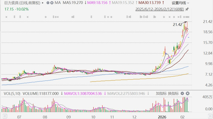 文章核心观点 - 巨力索具因被市场认定为商业航天火箭回收领域的核心供应商,其股价在短期内出现近200%的暴涨,市值飙升引发市场高度关注 [4][9][11] - 公司股价暴涨的逻辑源于其产品被指应用于国内首次液体火箭海上发射回收试验的“网系绳索回收系统”,市场将其视为“A股唯一被官方实锤”的供应商 [7][8] - 公司基本面与市场热度存在显著反差,其长期业绩平平、股东大幅减持、财务存在瑕疵及现金流压力等问题,为这轮行情增添了不确定性 [22][24][27] 公司近期市场表现与驱动因素 - 自2025年底以来,公司股价从6.75元飙升至18.88元,涨幅近200%,年内涨幅超过105% [9] - 股价飙升的直接催化剂是“领航者”国产火箭网系回收海上平台于2025年11月30日成功交付,以及即将进行的国内首次液体火箭海上发射回收试验 [6][7] - 市场情绪被一篇“小作文”点燃,该文宣称巨力索具是“火箭回收网的直接缔造者”,为A股唯一被官方实锤提供核心产品的上市公司 [7][8] - 公司董秘在投资者关系记录中证实,其产品应用于国内首个可回收捕获臂的生产、火箭地面静态试验拉索装置及回收转运装置等多个环节 [9] 公司业务背景与行业地位 - 公司是索具行业隐形冠军,创始人杨建忠被称为“索具大王”,企业从木匠作坊起步,凭借满足客户需求的生存哲学发展壮大 [13][14] - 公司是业内唯一同时进入神舟、嫦娥、长征、天宫、天问五大系列航天供应链的民营企业,积累了深厚的航天工程经验 [16] - 公司已成为蓝箭航天、星际荣耀、星河动力、东方空间等国内主要商业航天公司在地面保障设备(如起吊转运、级段翻转)方面的可靠供应商 [17] 公司治理与公众形象 - 公司为家族企业,由杨建忠、杨会德、杨建国等家族成员领导,但公众形象因三弟杨子(杨建民)而高度娱乐化 [14][17] - 杨子虽未在上市公司担任董监高,且其持有的巨力集团股权已减持至3.41%,但其“霸道总裁”个人IP与家族企业深度绑定,为公司带来巨大公众流量 [20] 公司财务与经营状况 - 公司自2010年上市以来,累计实现净利润仅6.59亿元,近年工程机械行业环境不佳,已连亏两年,2025年预告净利润为0.16-0.21亿元,同比扭亏 [22] - 控股股东杨氏家族自2013年限售股解禁后持续密集减持,累计套现金额超过28亿元,是公司上市以来总净利润的四倍有余,最近一次于2025年11月协议转让套现3.11亿元 [22][23] - 截至2025年9月末,公司应收账款余额高达12.77亿元,占当期营收比例超过70%,形成“应收账款堰塞湖” [26] - 2025年前三季度,公司营收同比增长13.2%,但经营活动产生的现金流量净额为-1.1亿元,呈现“回款慢”特征 [27] - 同期公司资产负债率达54.48%,短期借款及一年内到期有息负债规模超过15亿元,而账面货币资金仅4.8亿元,偿债压力凸显 [27] 监管与内控情况 - 2025年12月,河北证监局对公司出具行政监管措施决定书,直指其应收账款减值计提不准确、政府补助披露不及时、公司治理不规范三大问题 [24]