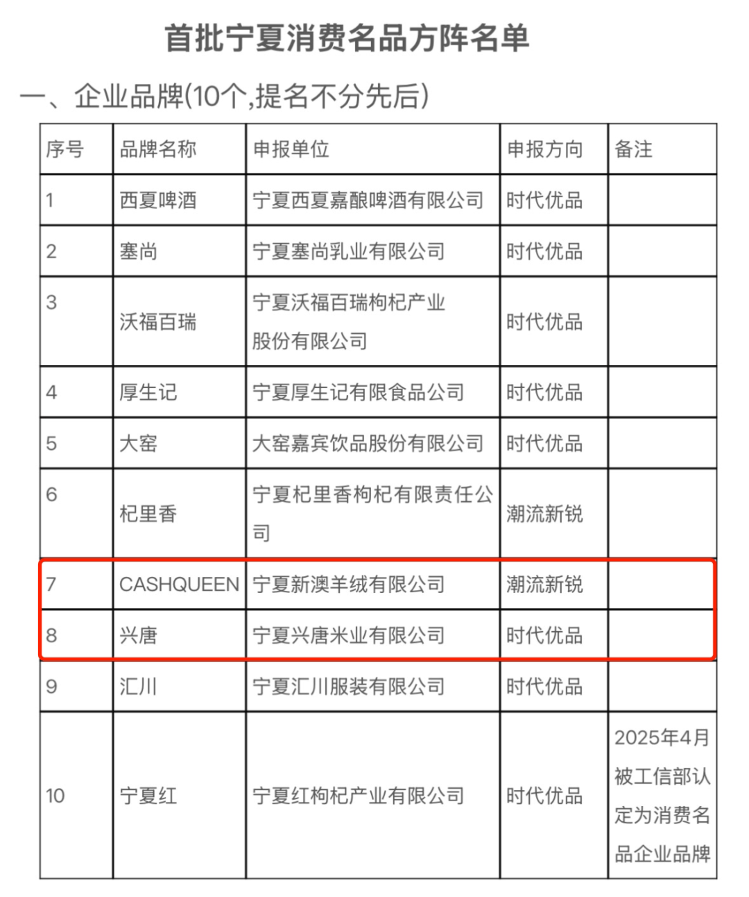 10月15日 自治区工业和信息化厅公布 首批宁夏消费名品方阵名单 | 序号 | 品牌名称 | 申报单位 | 申报方向 | 备注 | | --- | --- | --- | --- | --- | | 1 | 西夏啤酒 | 宁夏西夏嘉酿啤酒有限公司 | 时代优品 | | | 2 | 塞尚 | 宁夏塞尚乳业有限公司 | 时代优品 | | | 3 | 沃福自瑞 | 宁夏沃福百瑞枸杞产业 | 时代优品 | | | | | 股份有限公司 | | | | 4 | 厚生记 | 宁夏厚生记有限食品公司 | 时代优品 | | | 5 | 大窑 | 大窑嘉宾饮品股份有限公司 | 时代优品 | | | 6 | 杞里香 | 宁夏杞里香枸杞有限责任公 司 | 潮流新锐 | | | 7 | CASHQUEEN | 宁夏新澳羊绒有限公司 | 潮流新锐 | | | 8 | 兴唐 | 宁夏兴唐米业有限公司 | 时代优品 | | | 9 | 汇川 | 宁夏汇川服装有限公司 | 时代优品 | | | 10 | 宁夏红 | 宁夏红枸杞产业有限公司 | 时代优品 | 2025年4月 被工信部认 | | | | | | 定为消费名 品企业品牌 | 新澳 ...
